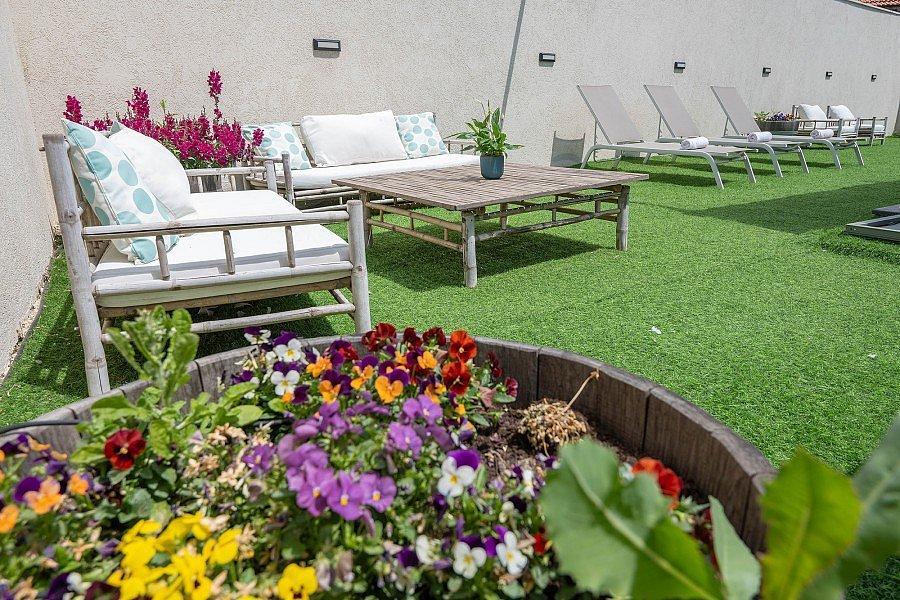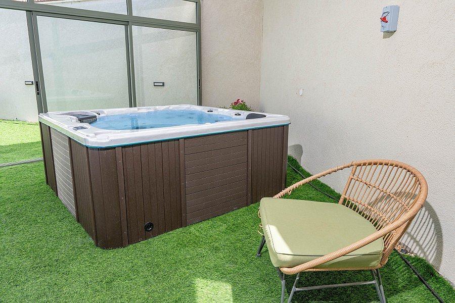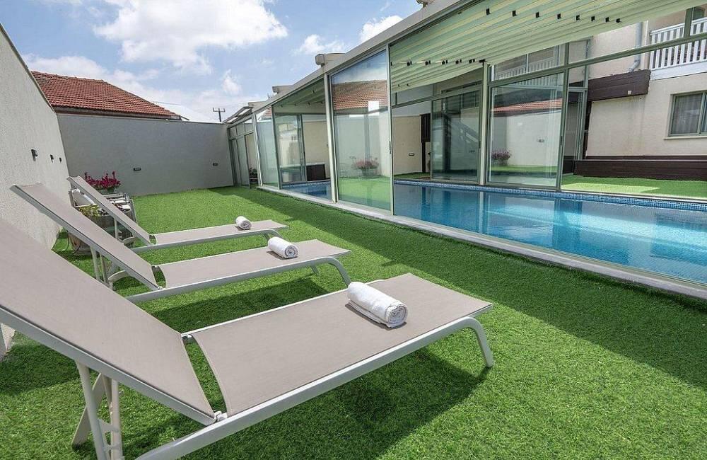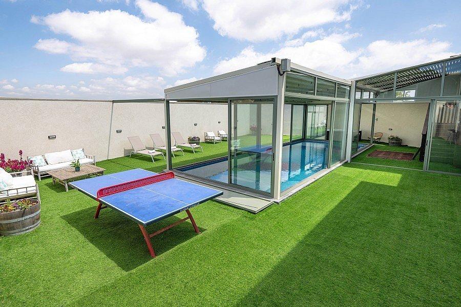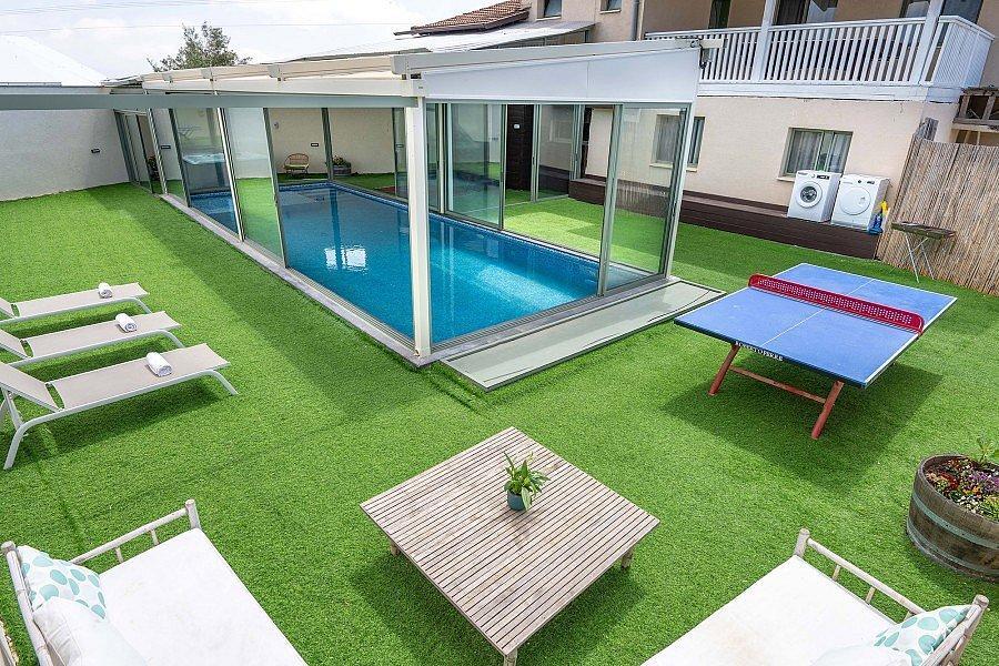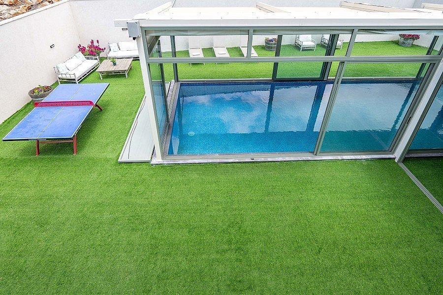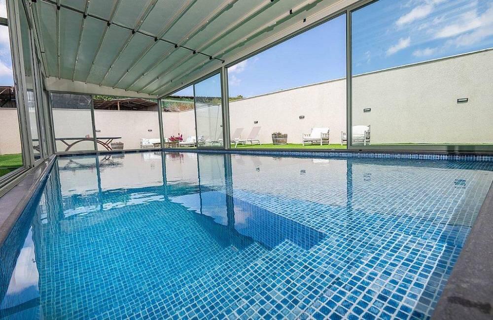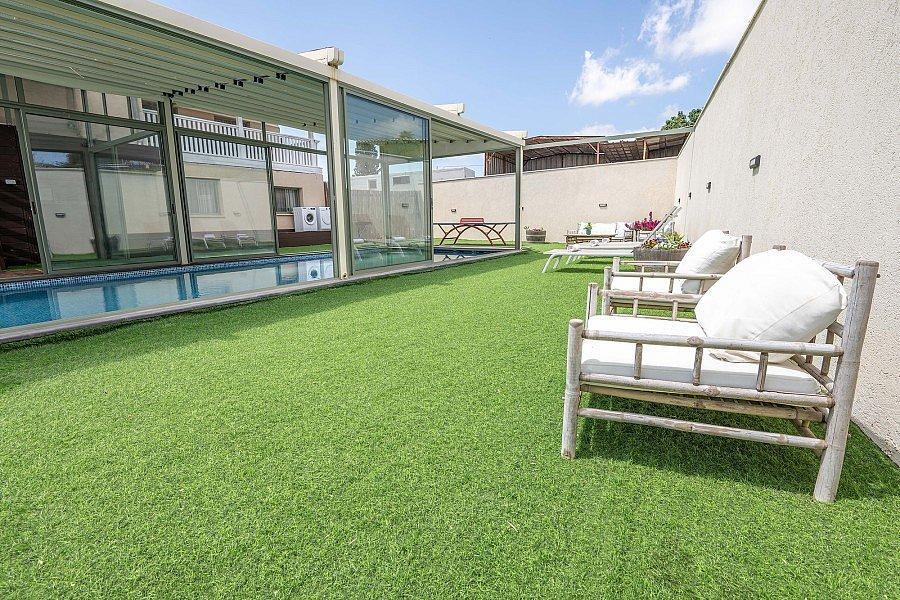 החצר הגדולה מציעה בריכה פרטית מגודרת, מחוממת ומקורה, ג’קוזי ספא, משחקים לילדים ומתחם ברביקיו.