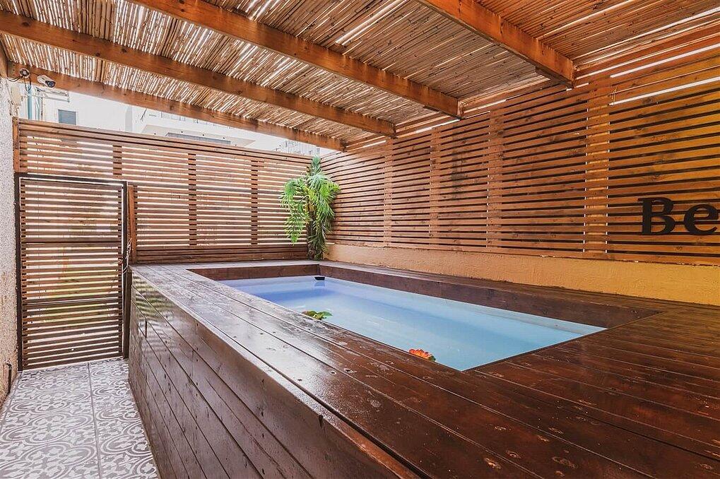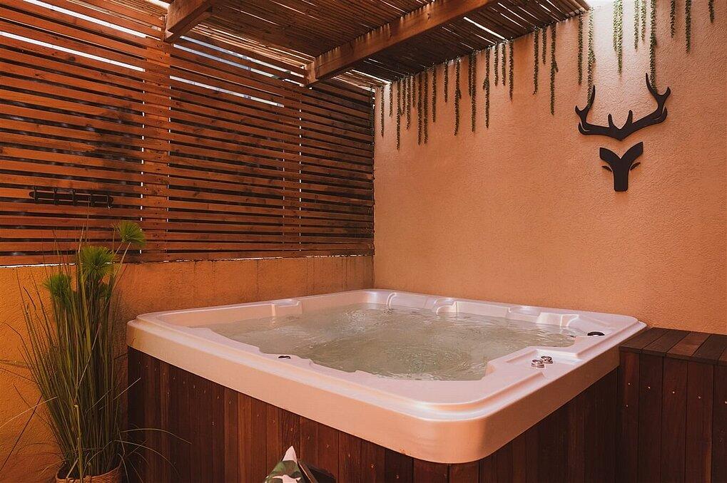 בשטח החיצוני מחכה לכם בריכה צלולה, ג'קוזי ספא מקורה, מדשאה סינטטית ופינות ישיבה ופנאי מפנקות.