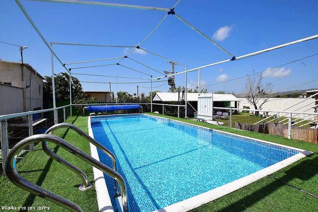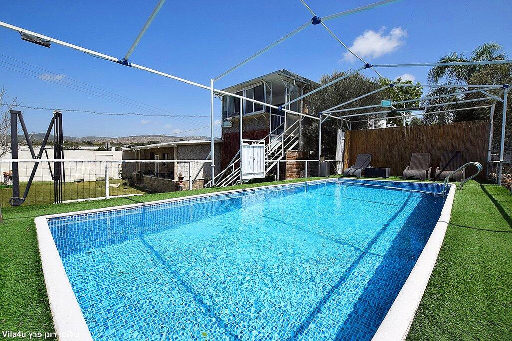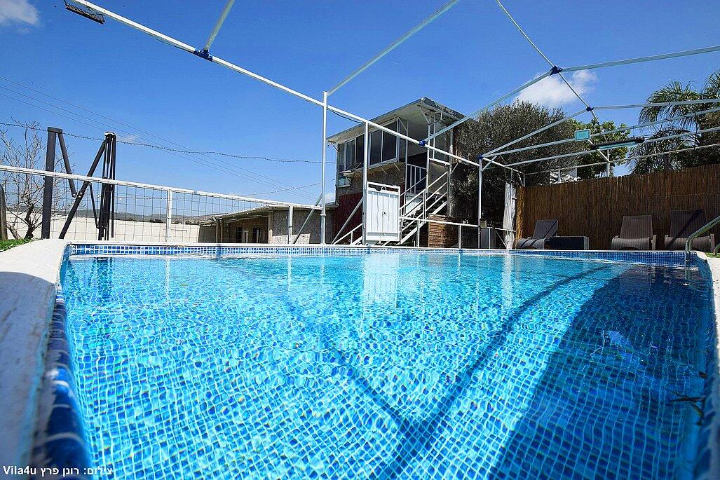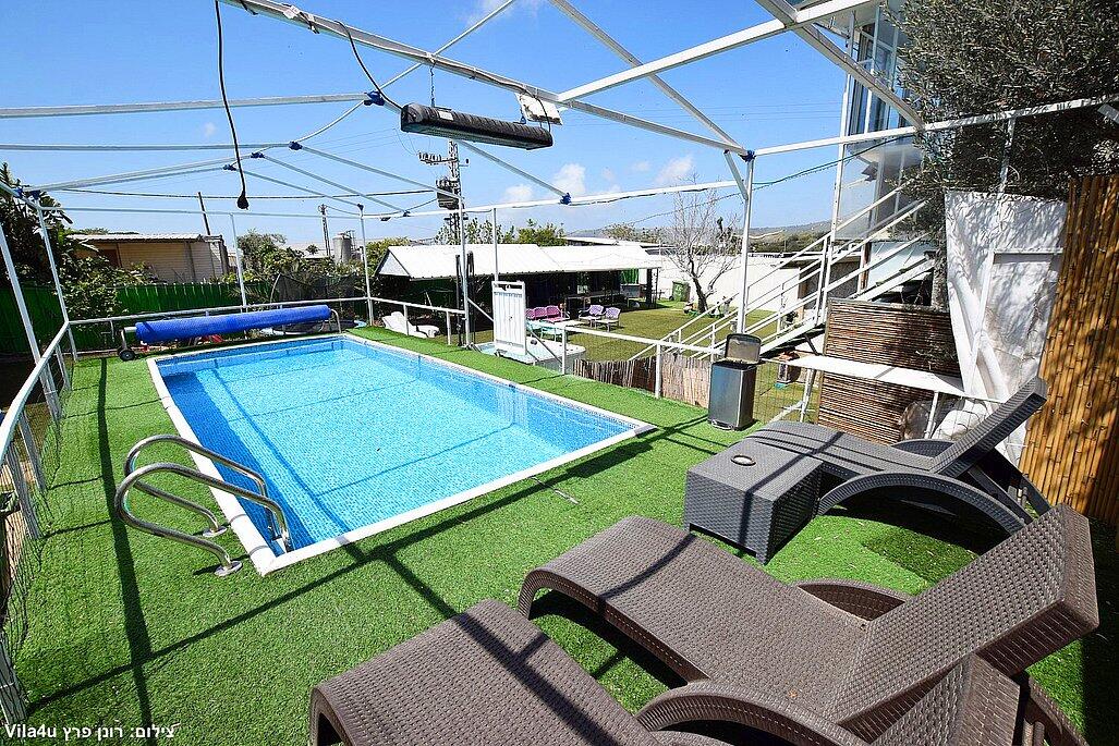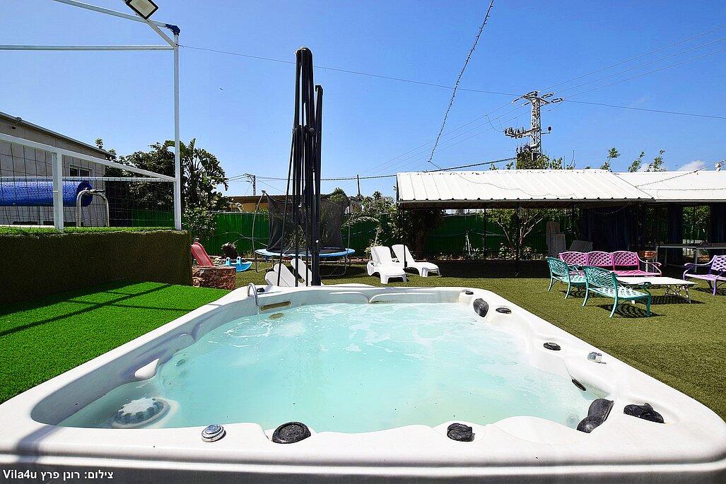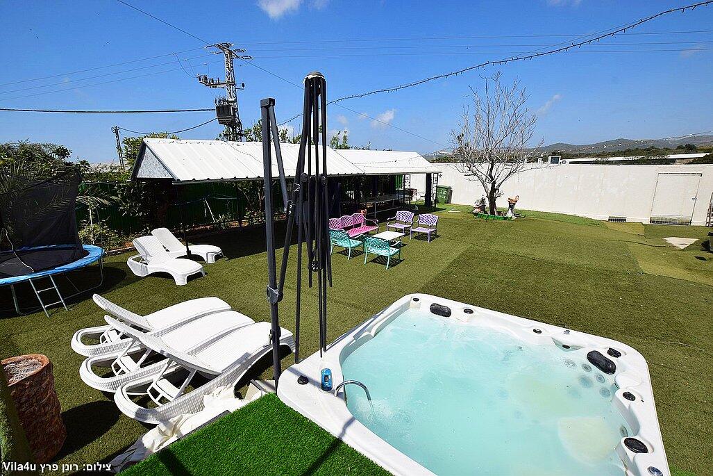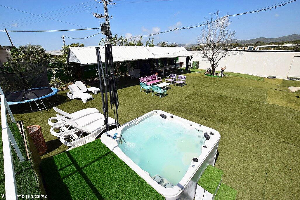 החצר המושקעת כוללת בריכה מחוממת, ג'קוזי ספא, פינת מנגל, שולחן פינג פונג, טרמפולינה לילדים ועוד. המקום אידיאלי לחופשה זוגית, משפחתית או קבוצתית עד 20 איש.