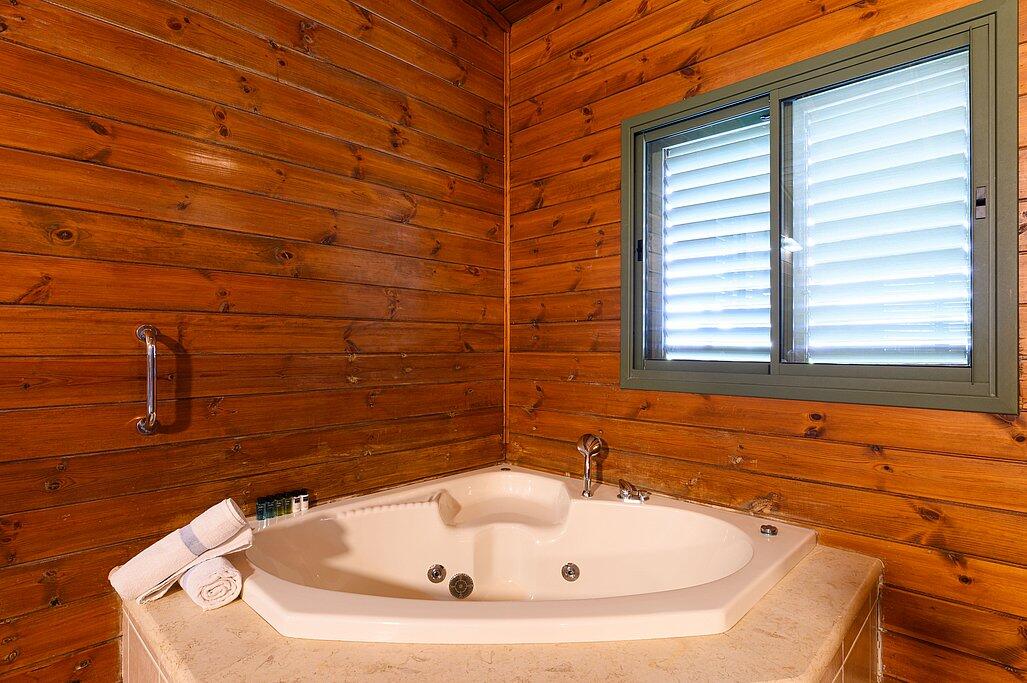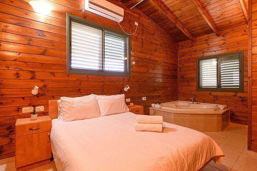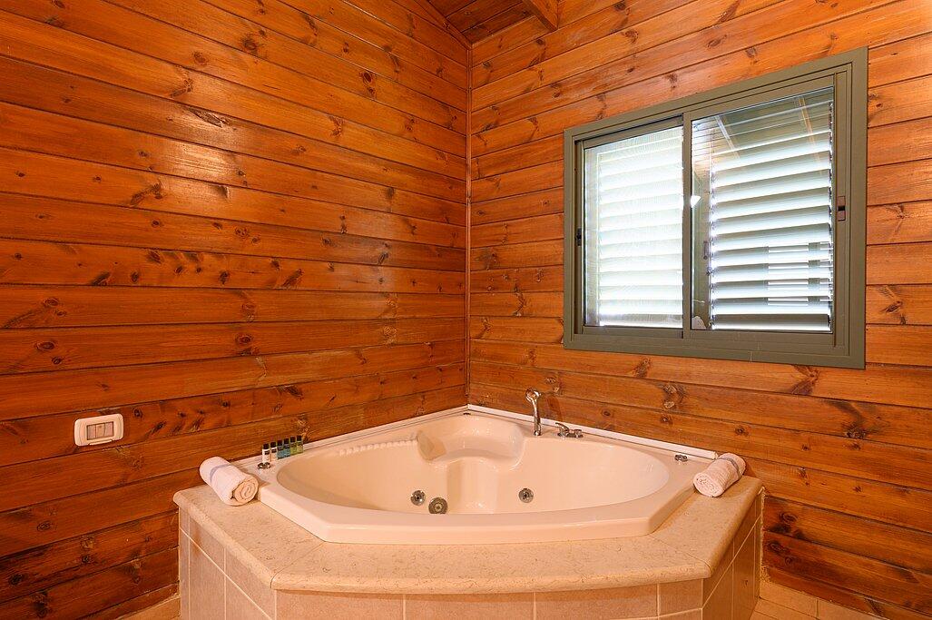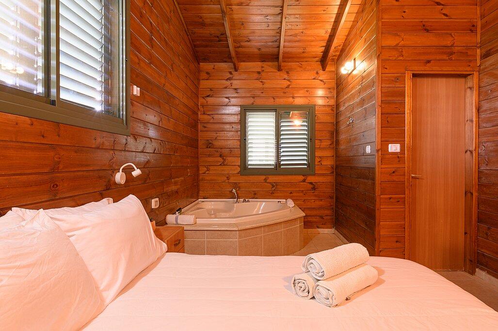 בקתות עץ חמימות עם ג'קוזי זוגי, בריכה ונוף פסטורלי.