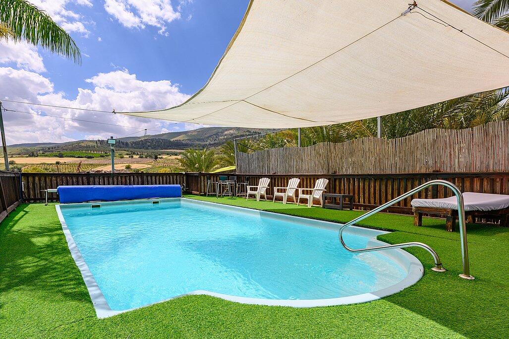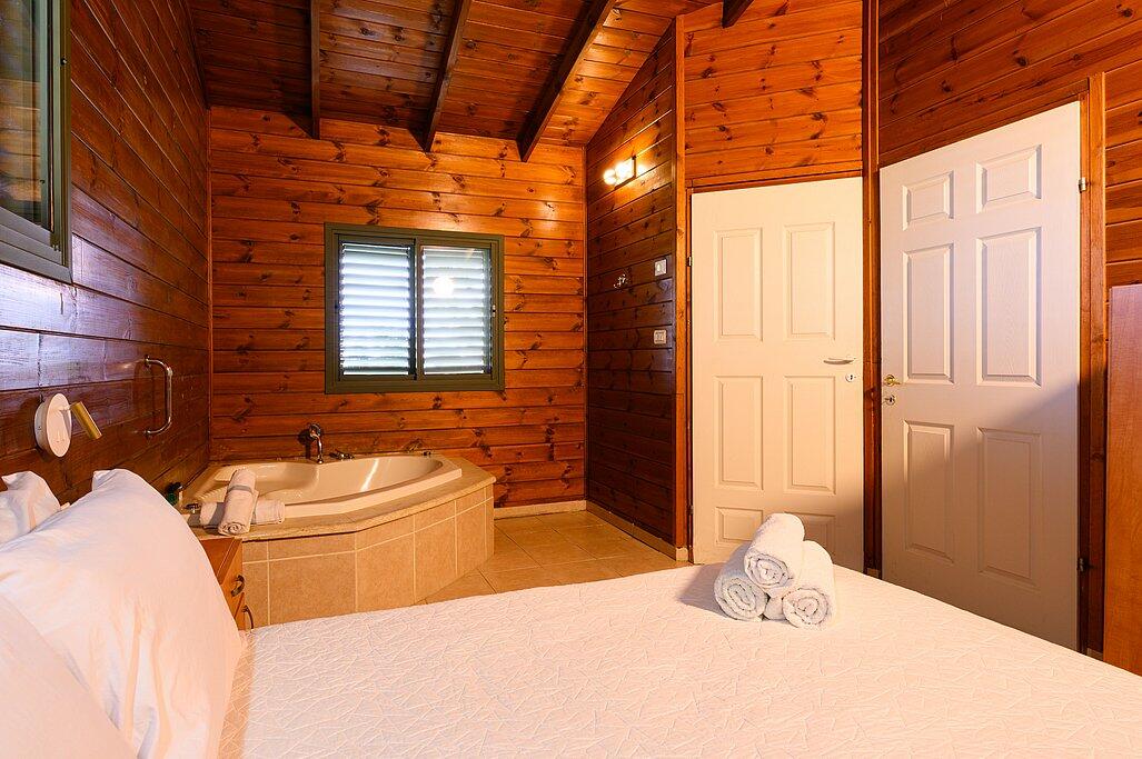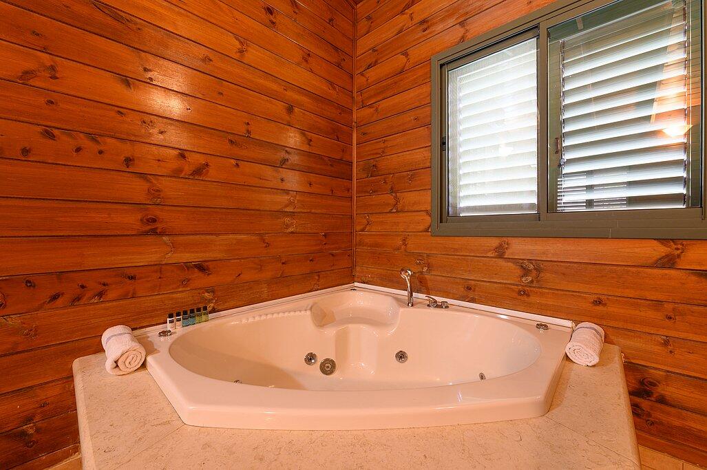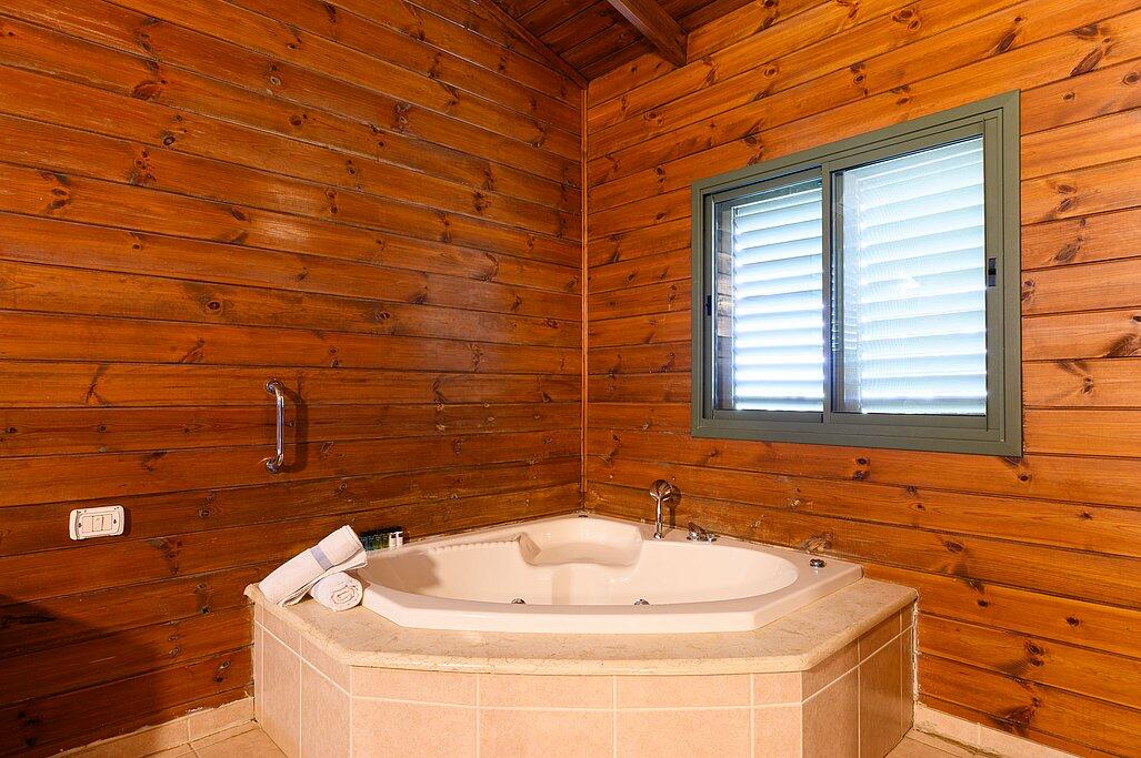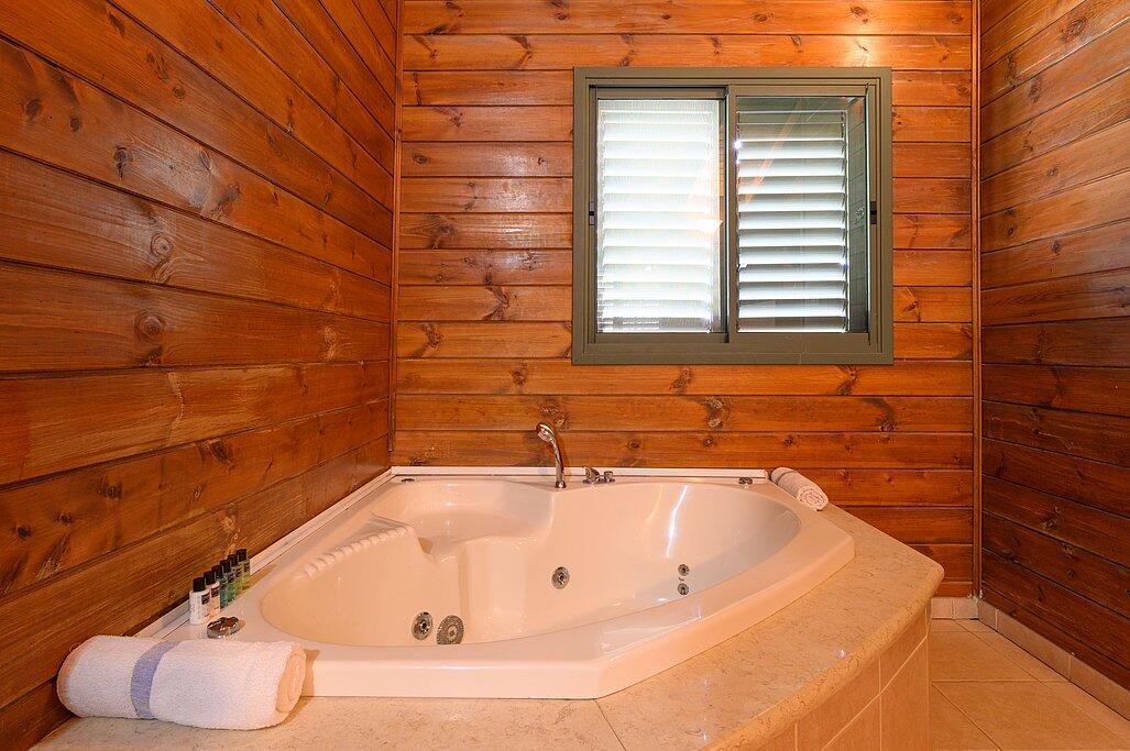 בקתות עץ חמימות עם ג'קוזי זוגי, בריכה ונוף פסטורלי.