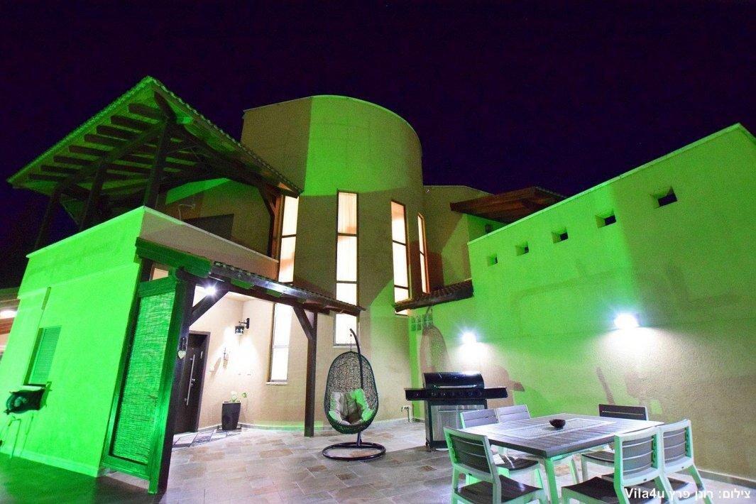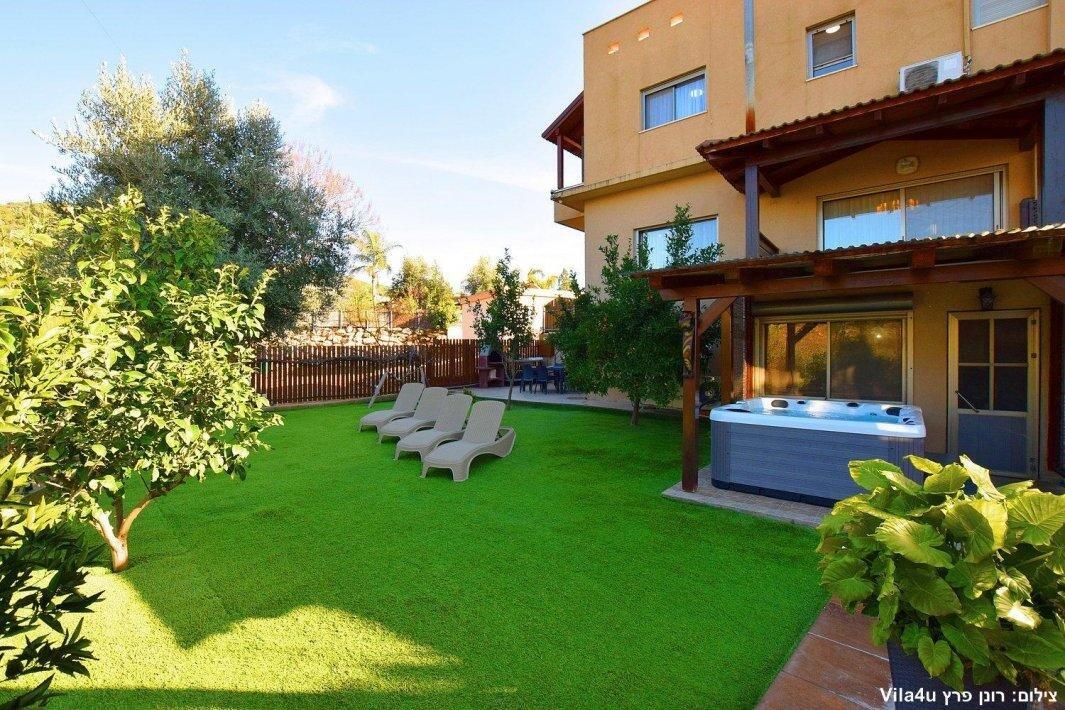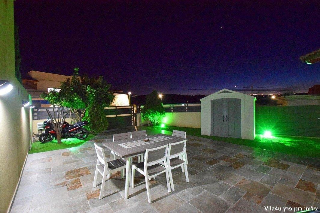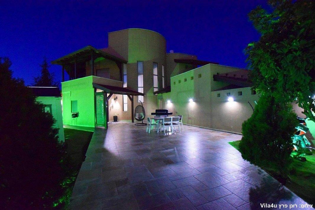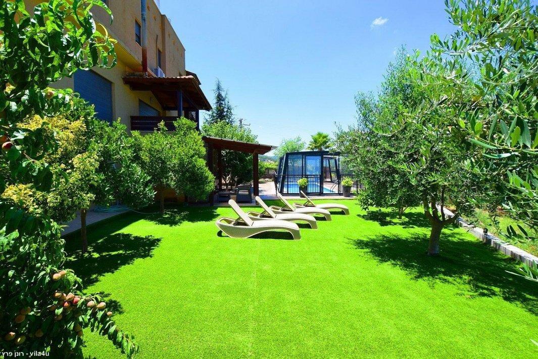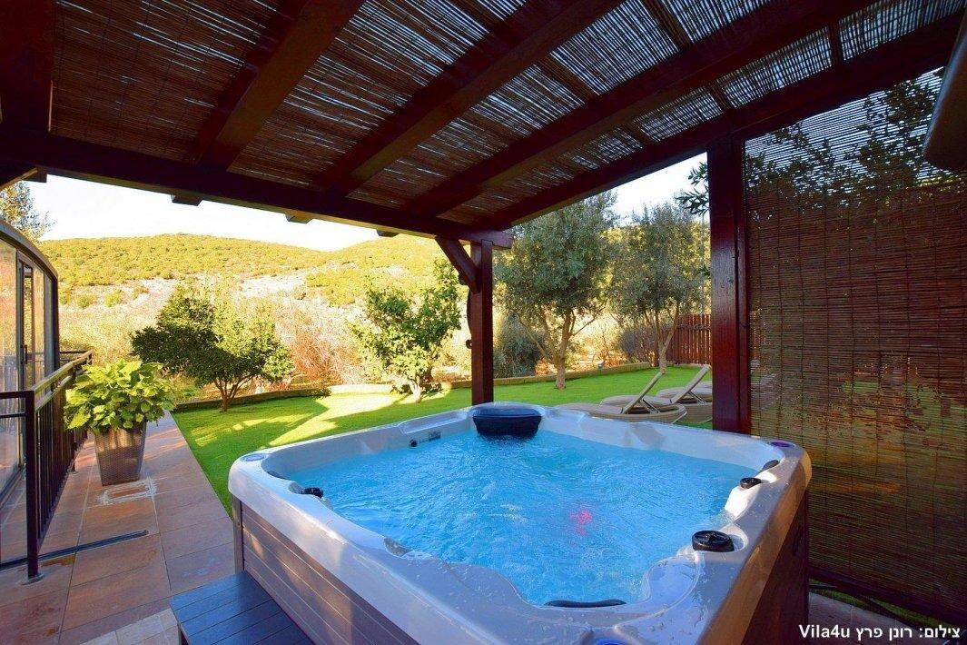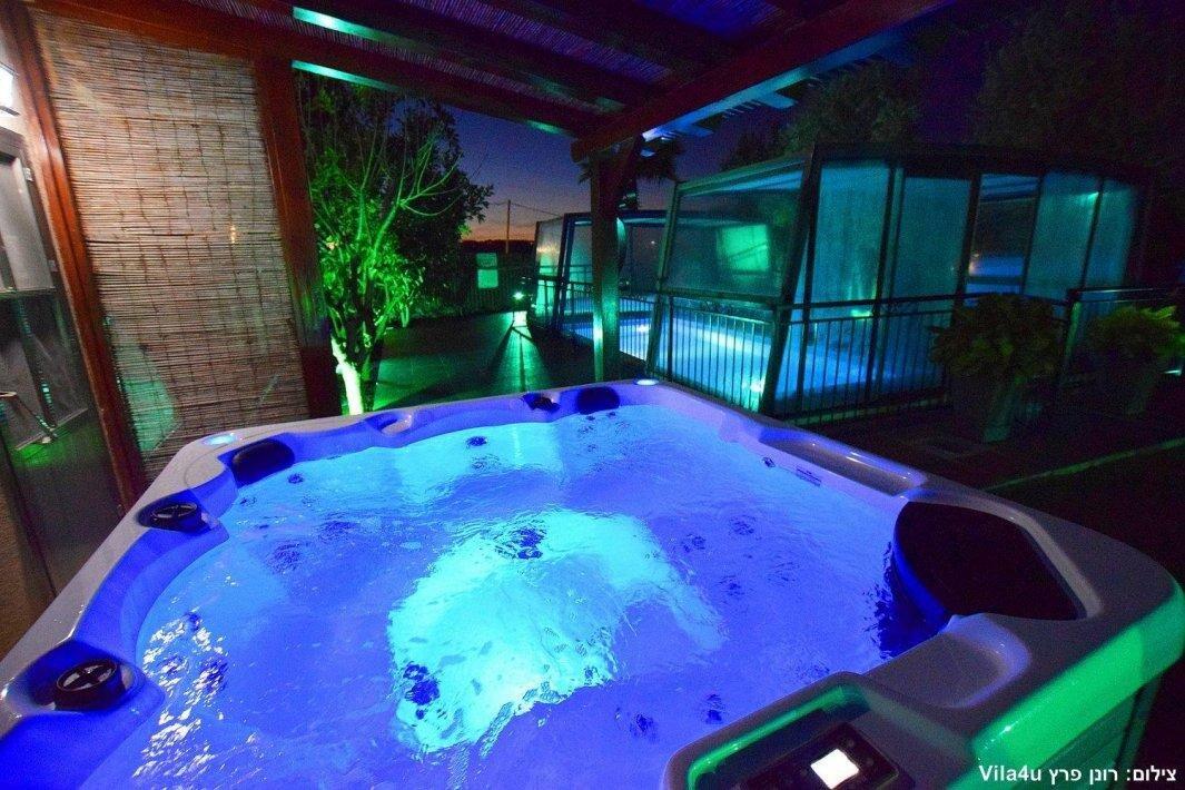 למתחם חצר ענקית ומטופחת עם בריכה גדולה מחוממת ומקורה בעונת החורף הקרה, ג'קוזי ספא מפנק, שולחנות משחק , עמדת מנגל , פינות ישיבה ועוד ועוד ועוד