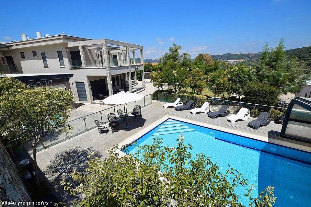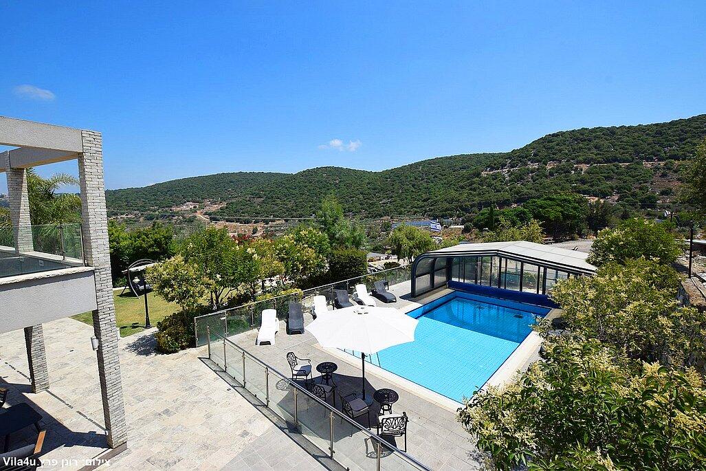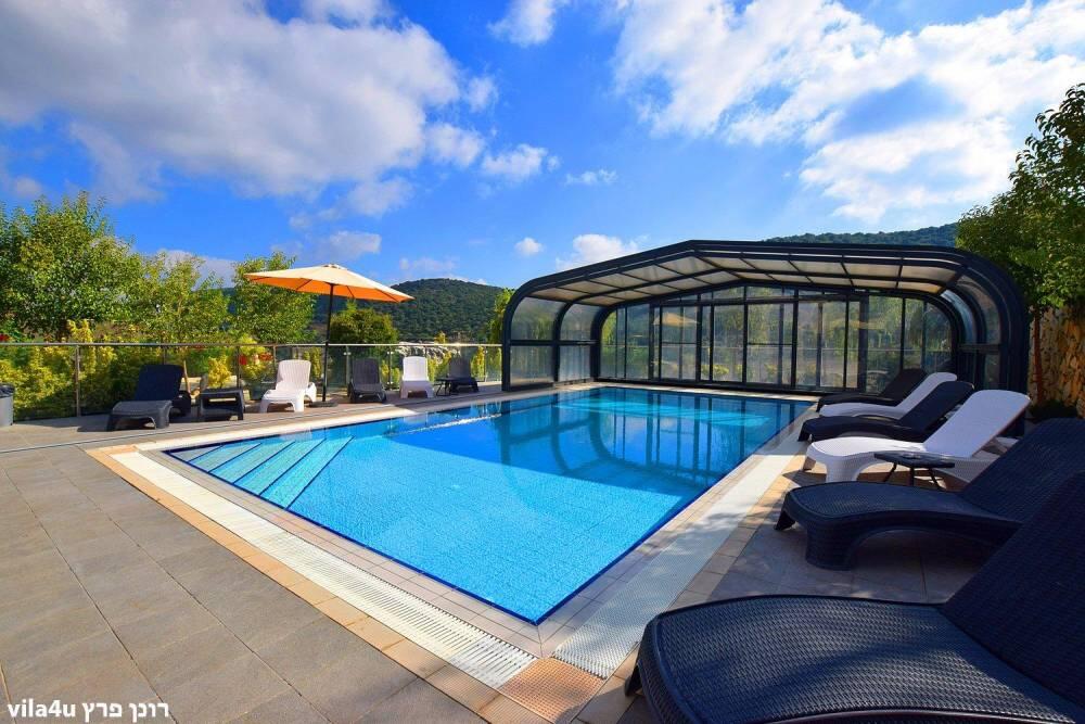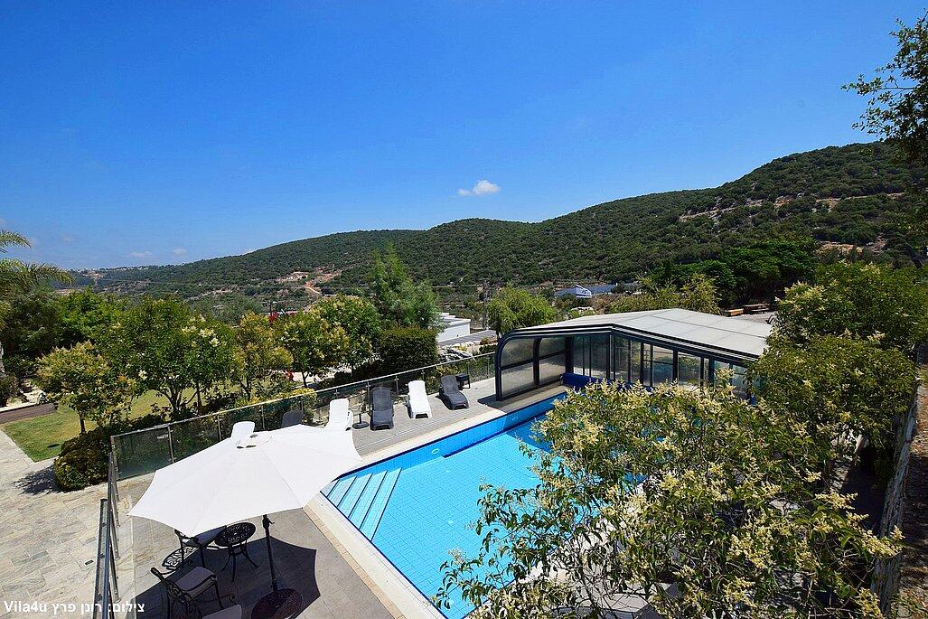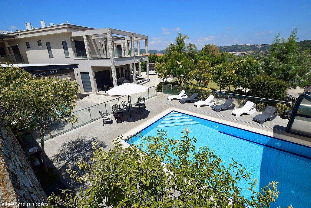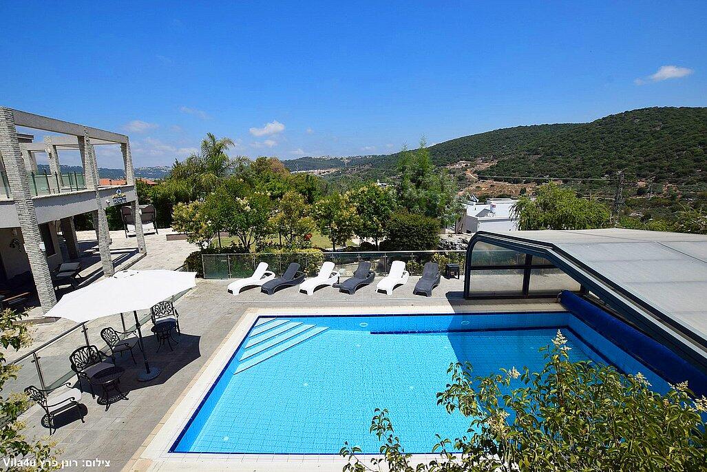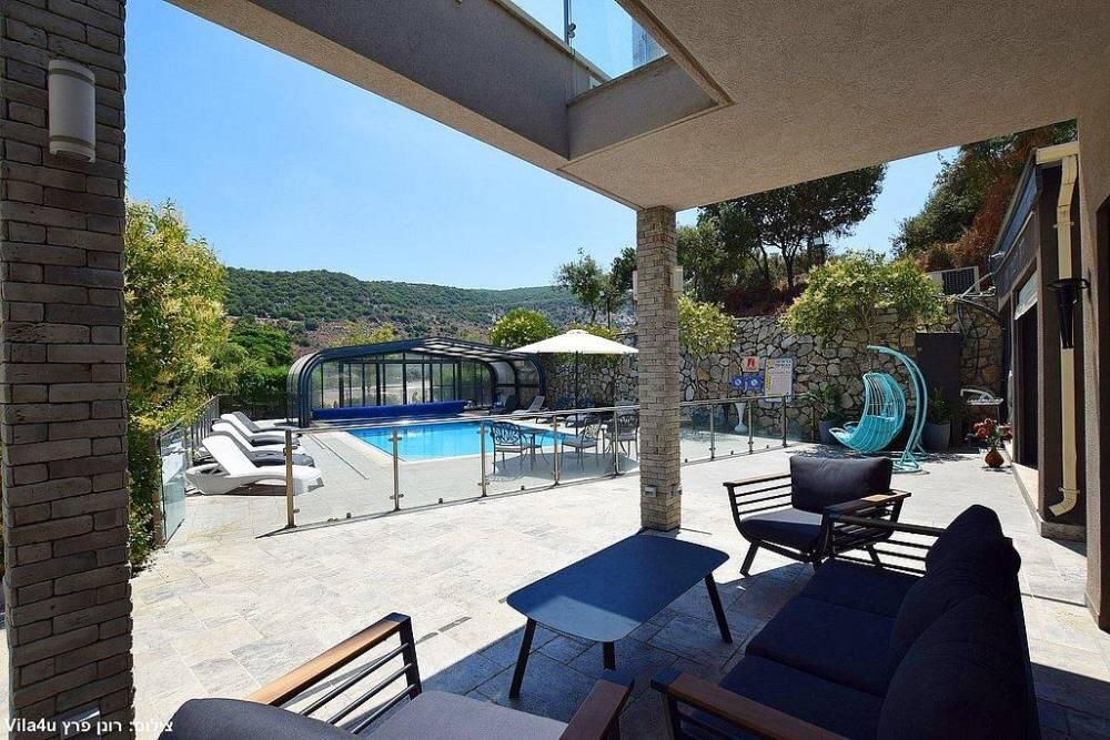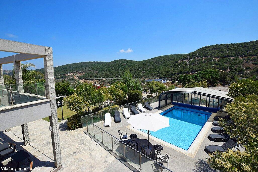 המתחם החיצוני משתרע אל מול נופים מדהימים עם בריכה מחוממת ומקורה בעונה הקרה, ג'קוזי ספא גדול, סאונה יבשה, שולחנות משחק , חצר ענקית ומטופחת עם תאוורת אווירה מלטפת.