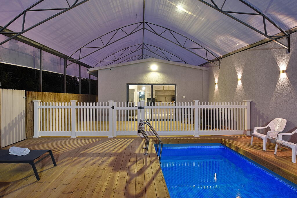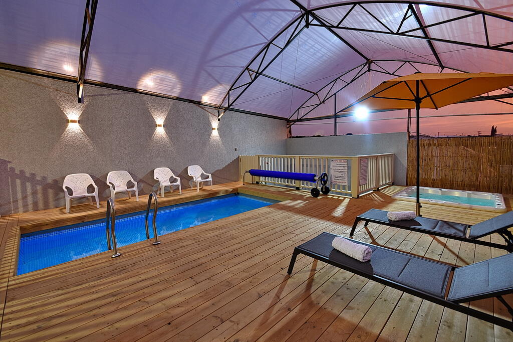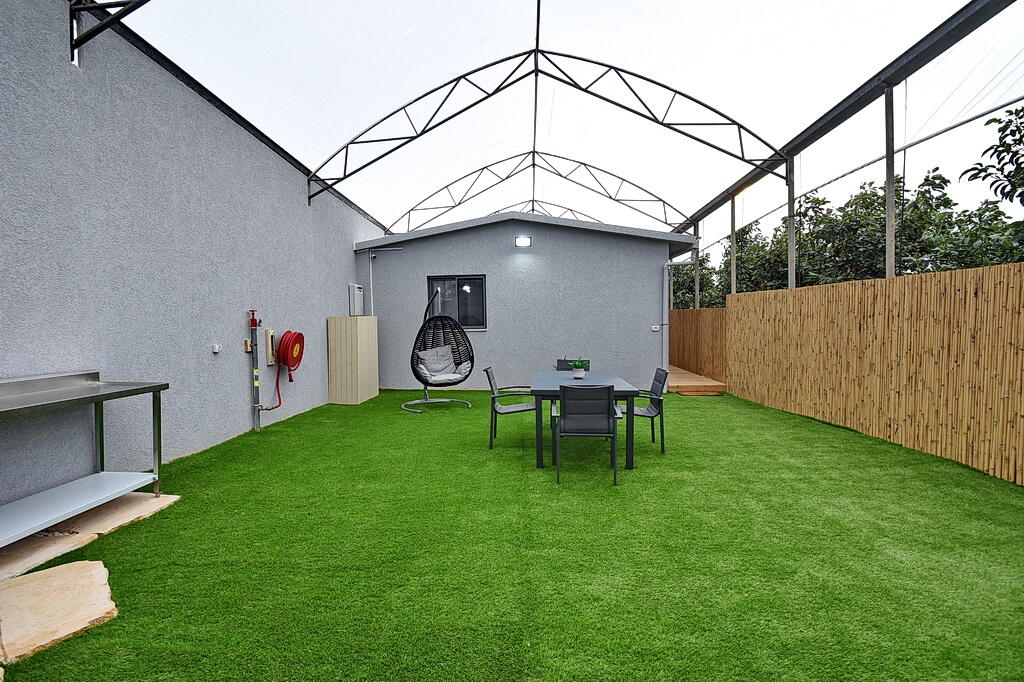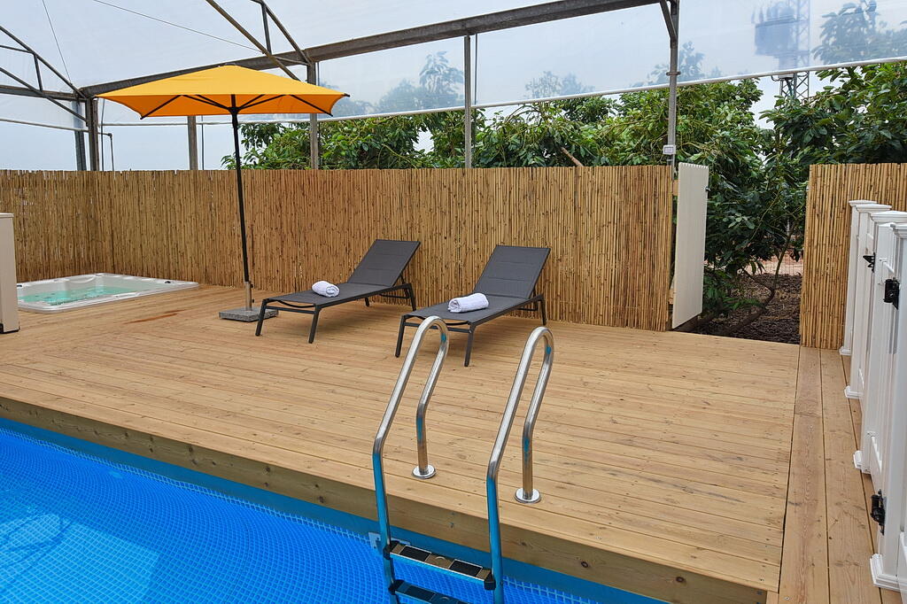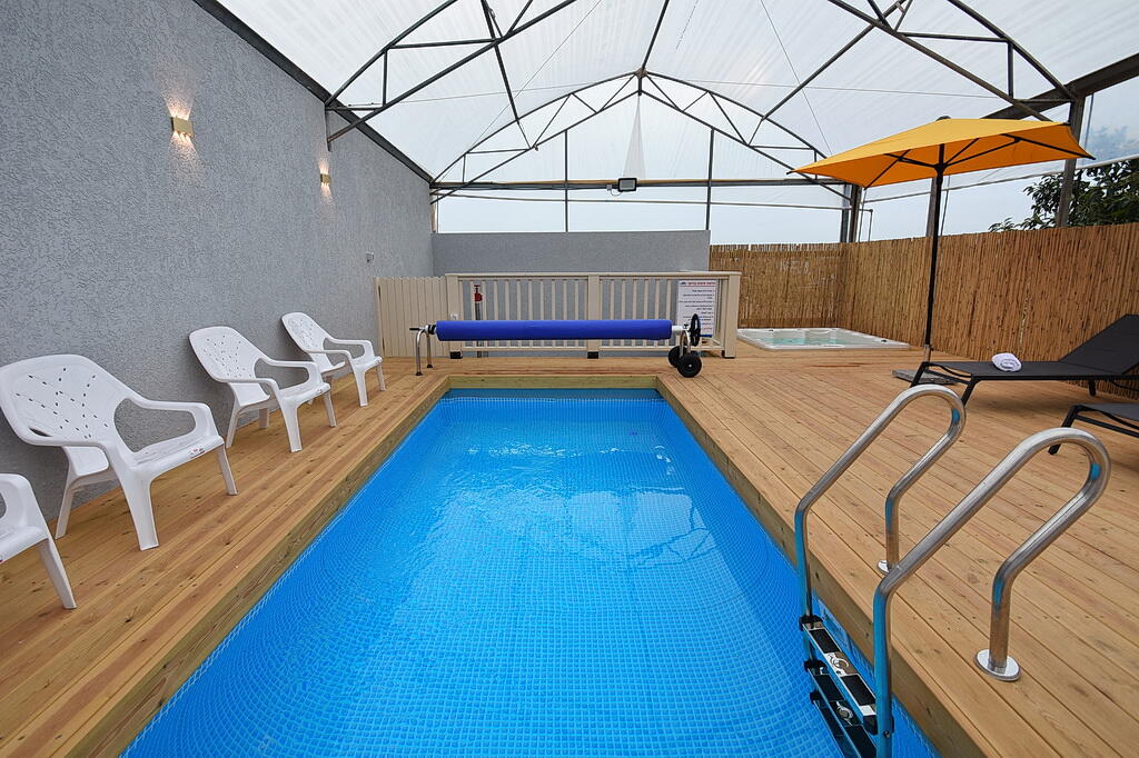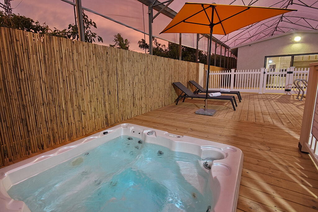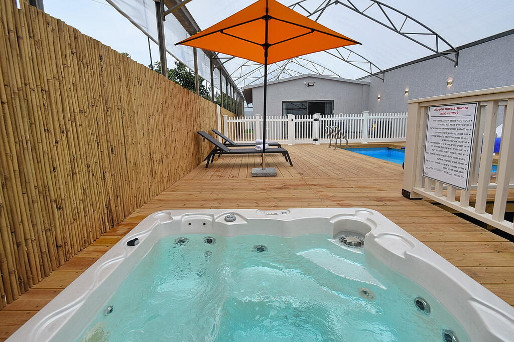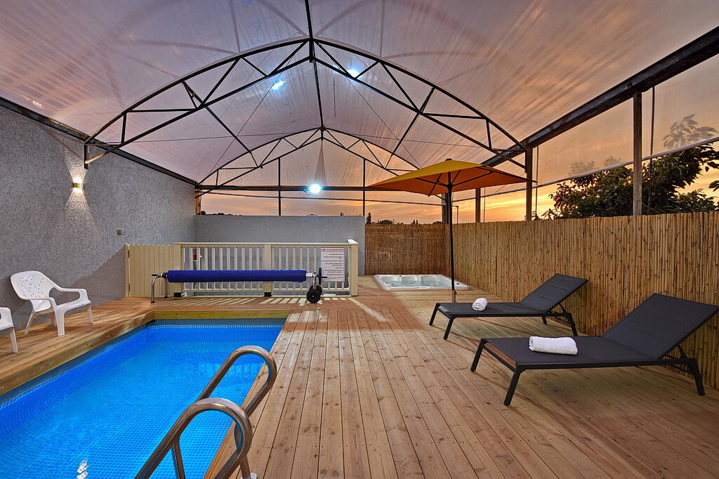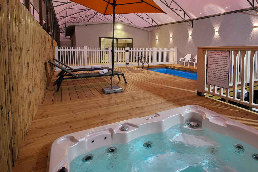 המתחם החיצוני כולל בריכה מחוממת ומקורה, גקוזי ספא מפנק, מדשאות עם מיטות שיזוף, ערסל וריהוט גן יוקרתי, לצד פינת מנגל ותאורה קסומה בערב.