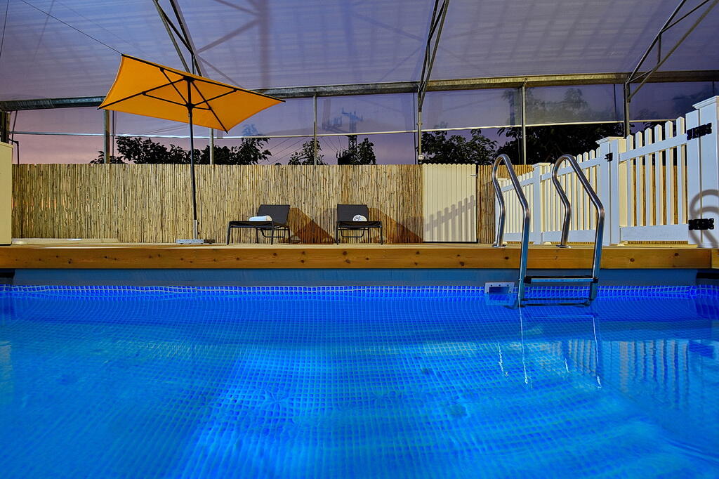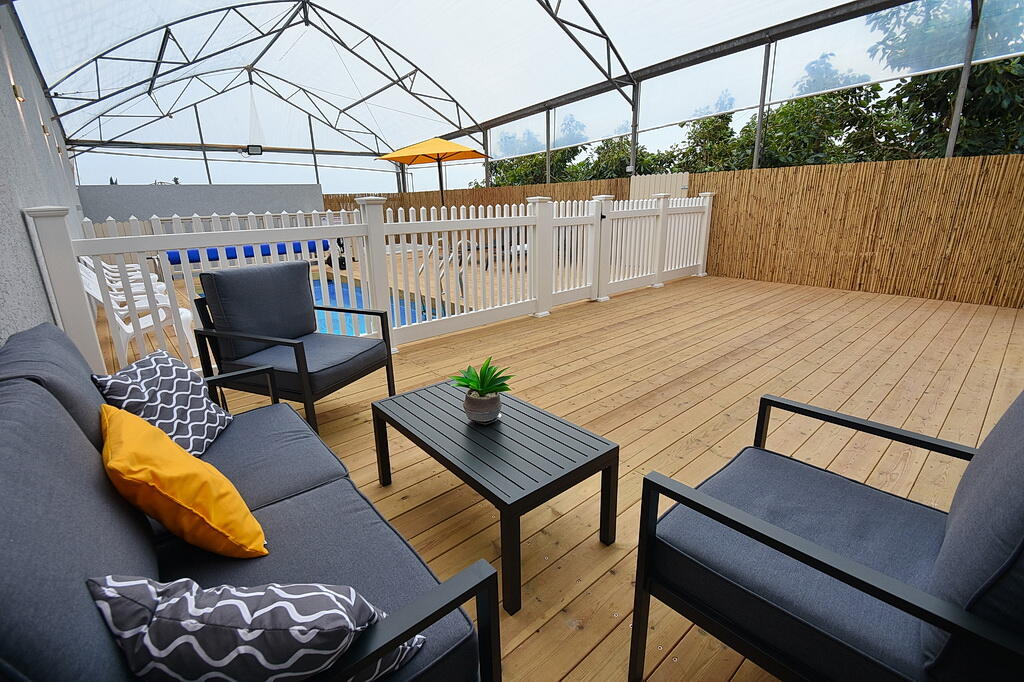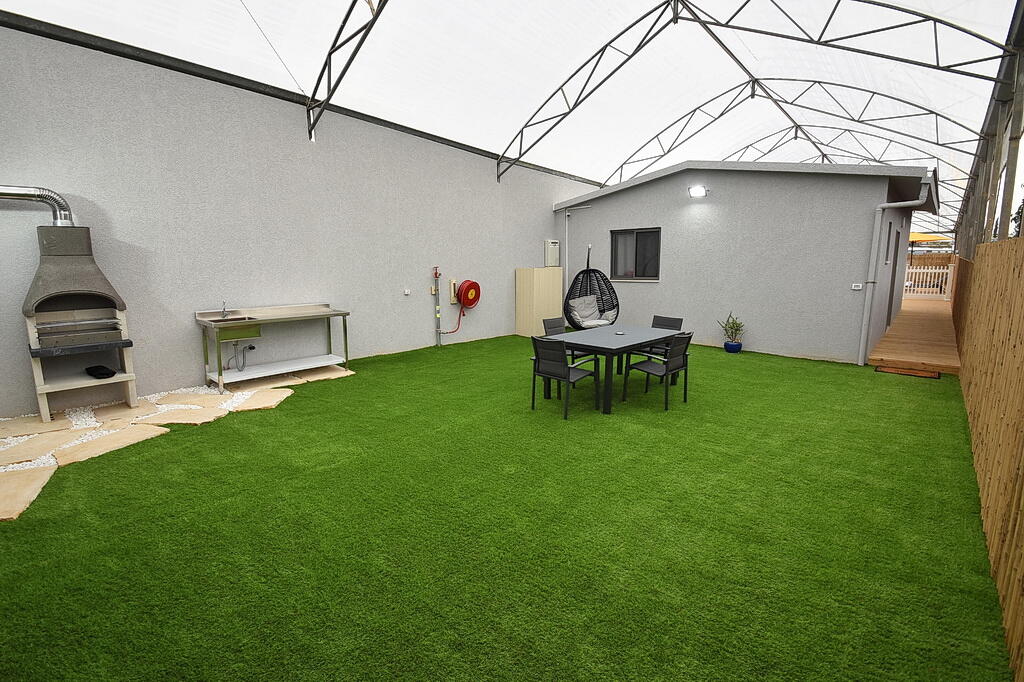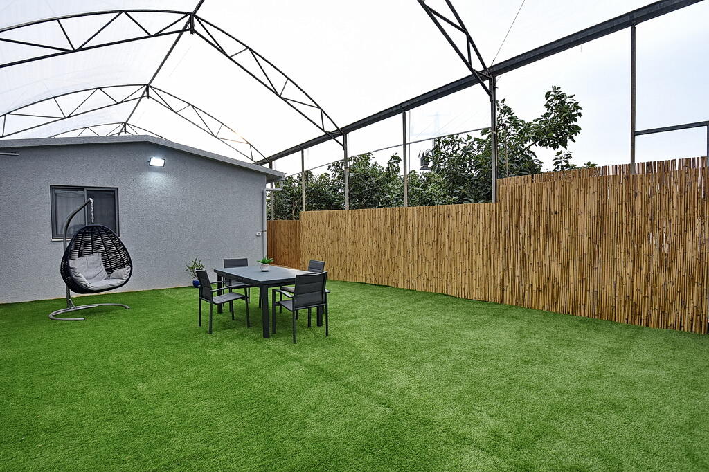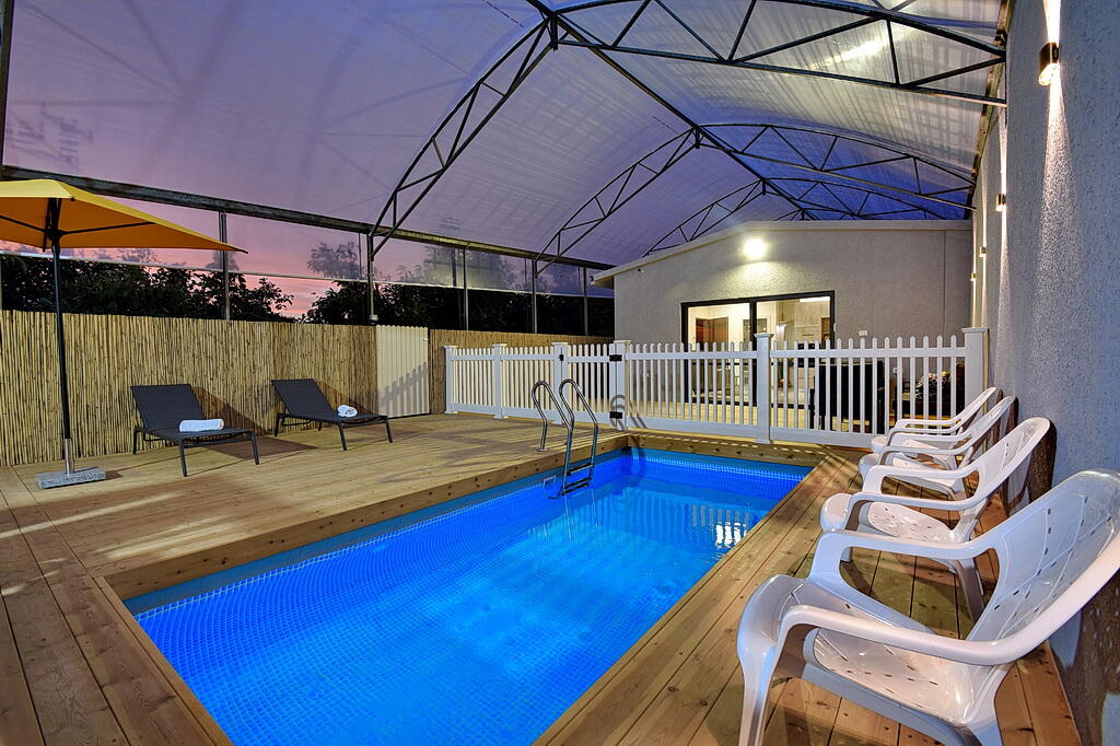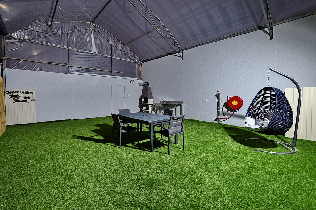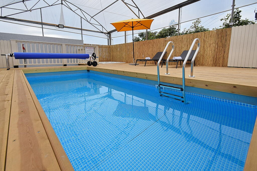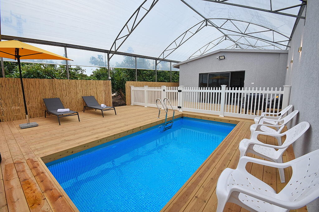 המתחם החיצוני כולל בריכה מחוממת ומקורה, גקוזי ספא מפנק, מדשאות עם מיטות שיזוף, ערסל וריהוט גן יוקרתי, לצד פינת מנגל ותאורה קסומה בערב.