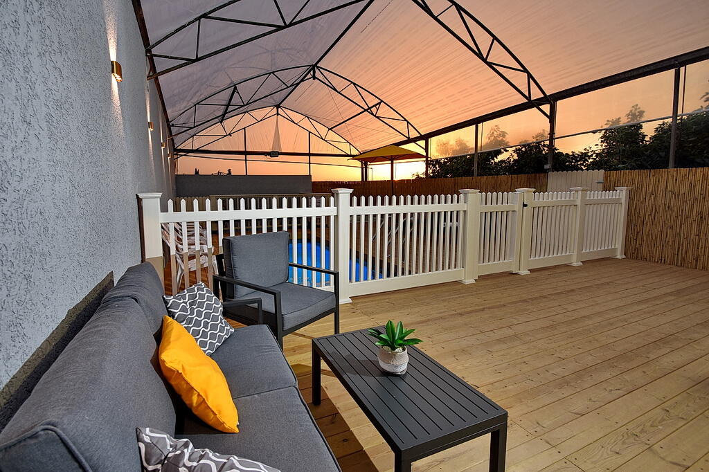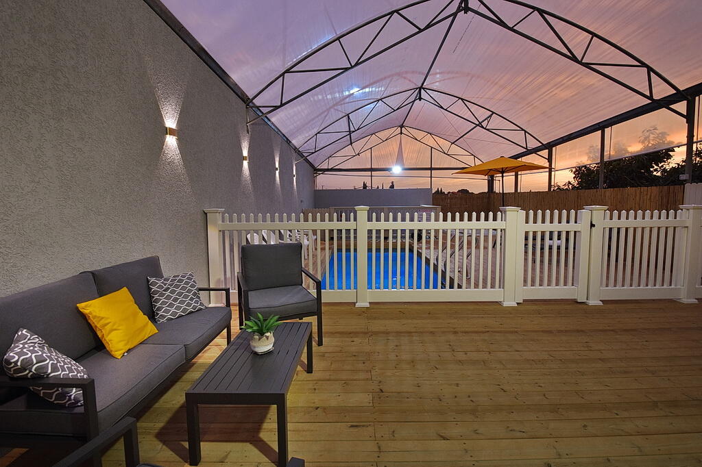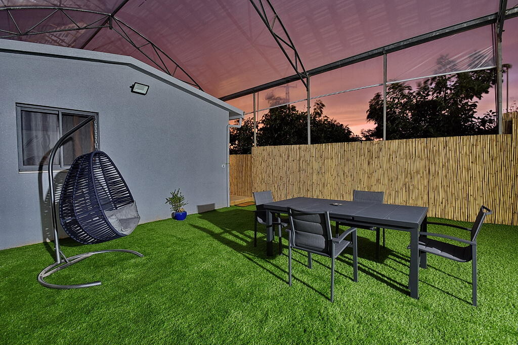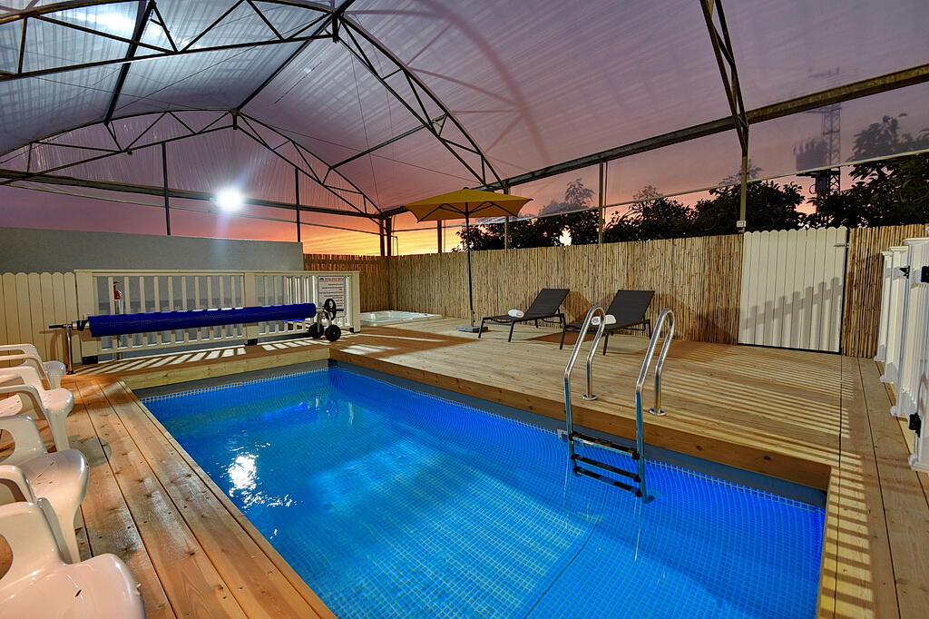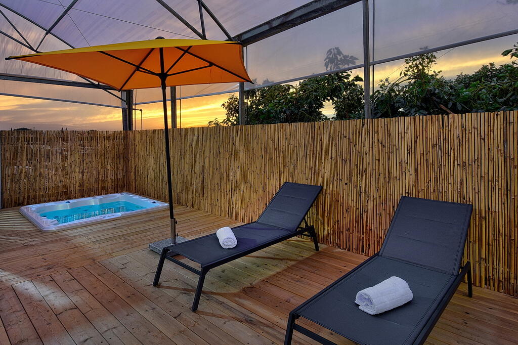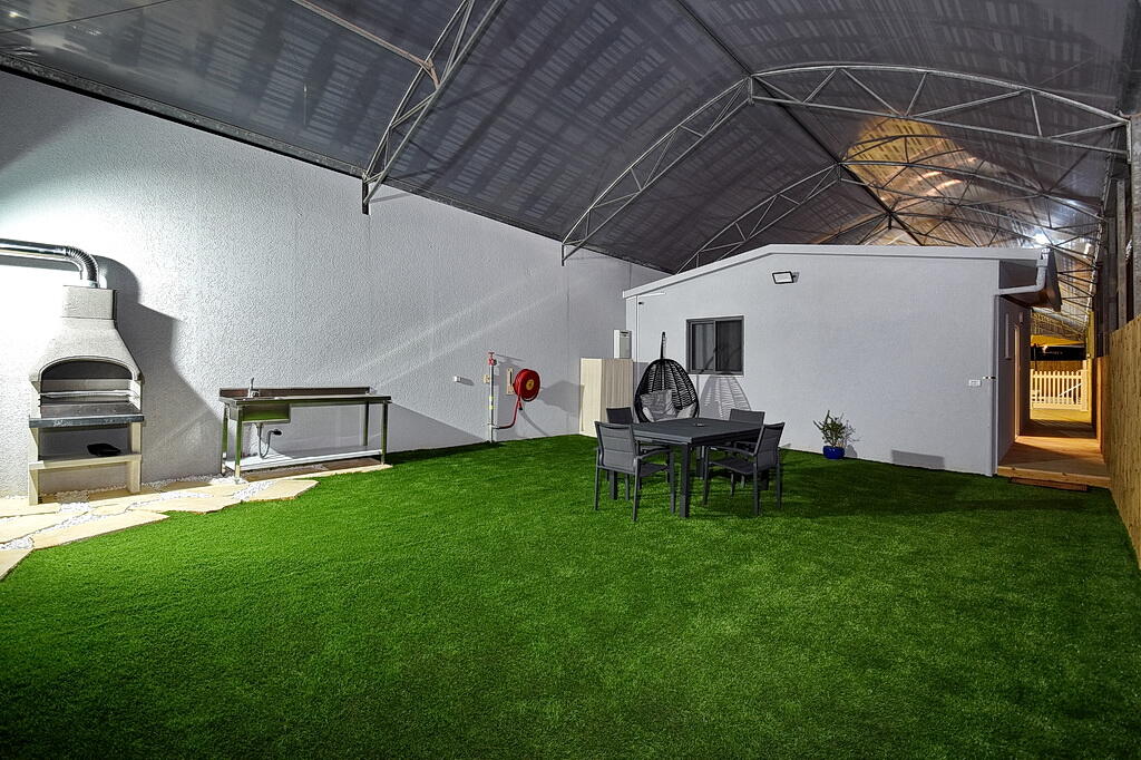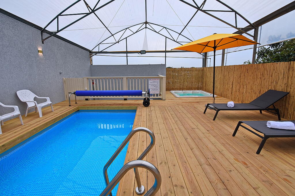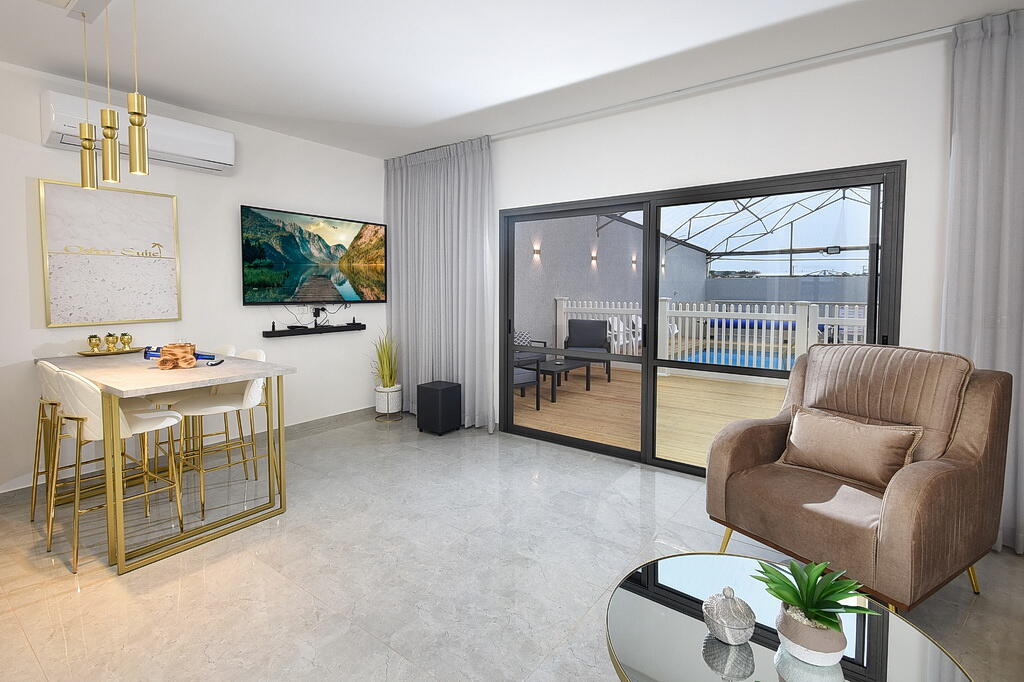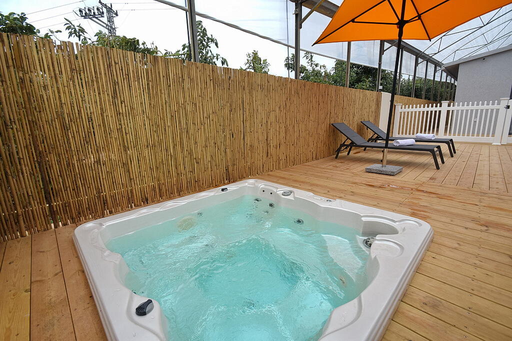 המתחם החיצוני כולל בריכה מחוממת ומקורה, גקוזי ספא מפנק, מדשאות עם מיטות שיזוף, ערסל וריהוט גן יוקרתי, לצד פינת מנגל ותאורה קסומה בערב.