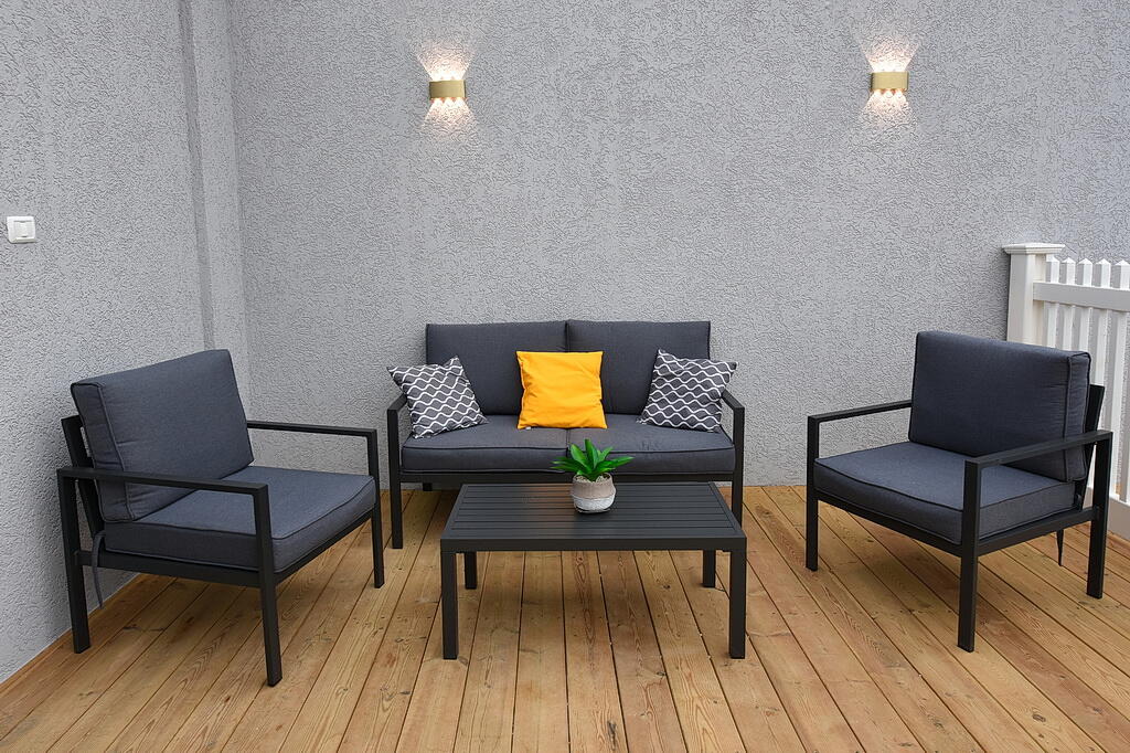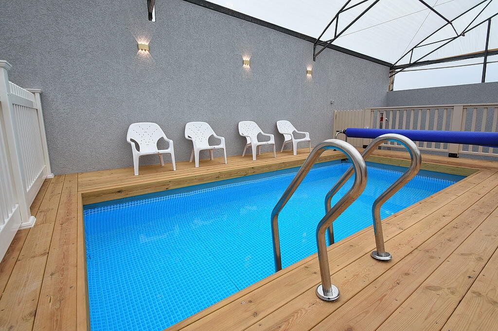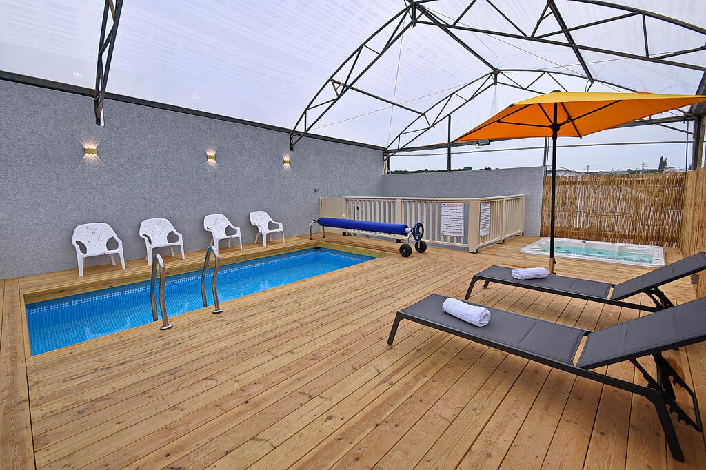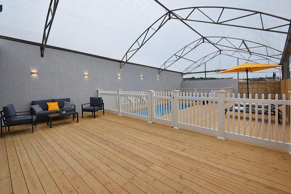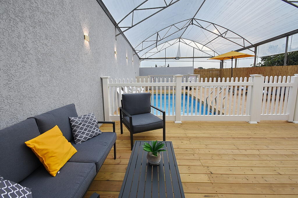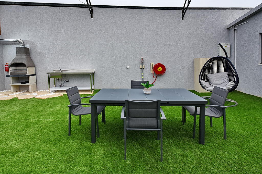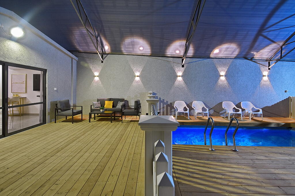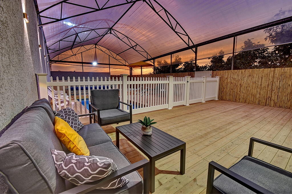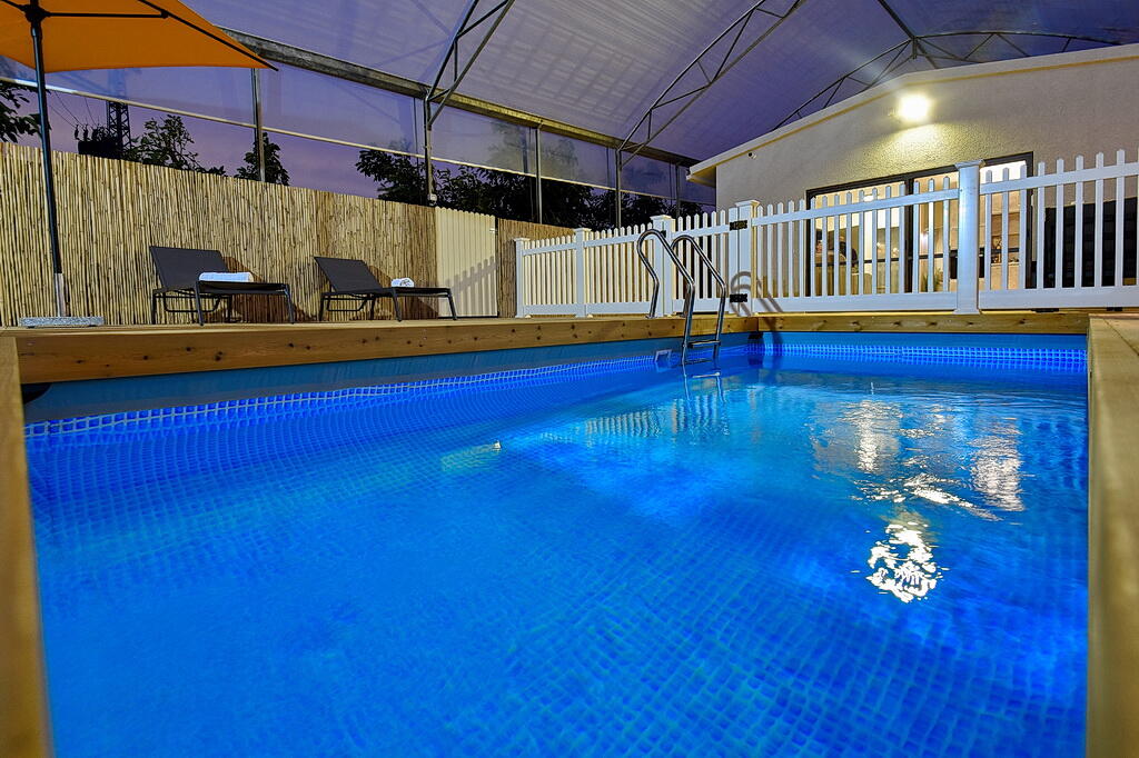 המתחם החיצוני כולל בריכה מחוממת ומקורה, גקוזי ספא מפנק, מדשאות עם מיטות שיזוף, ערסל וריהוט גן יוקרתי, לצד פינת מנגל ותאורה קסומה בערב.