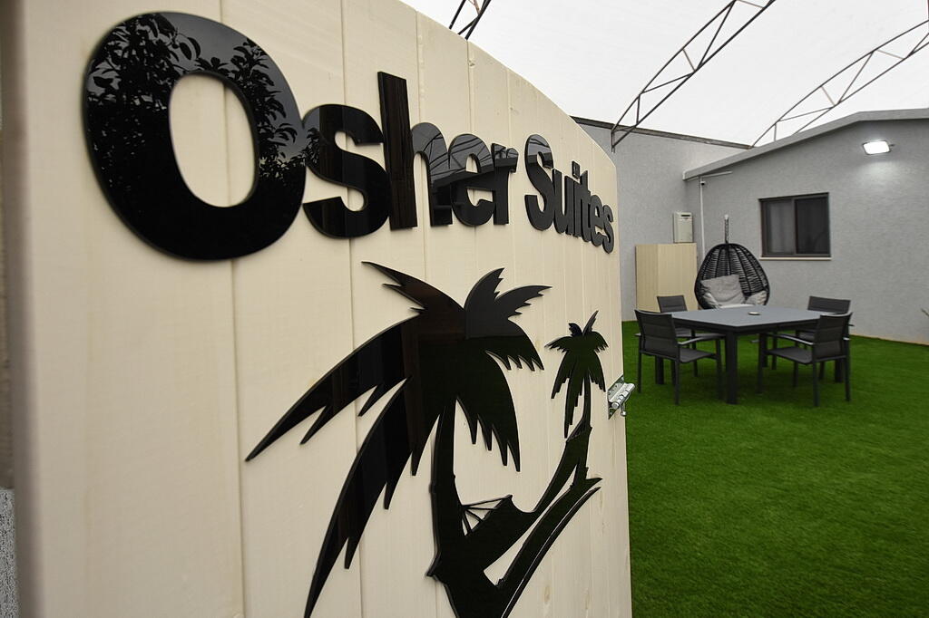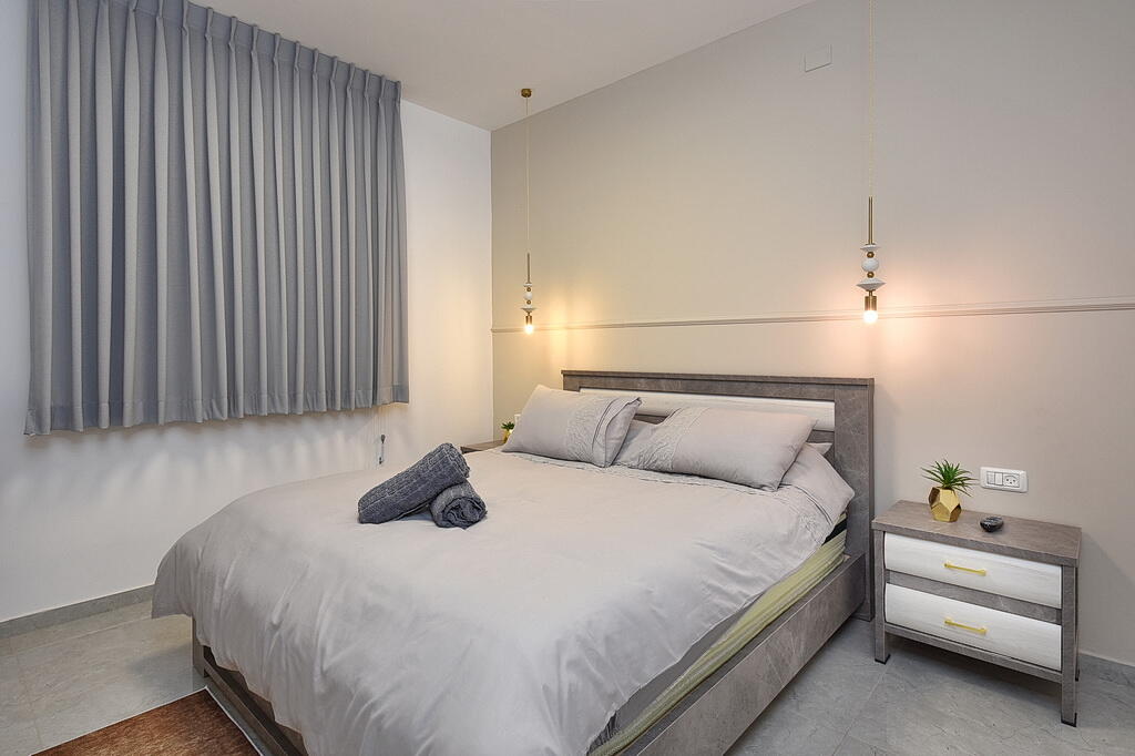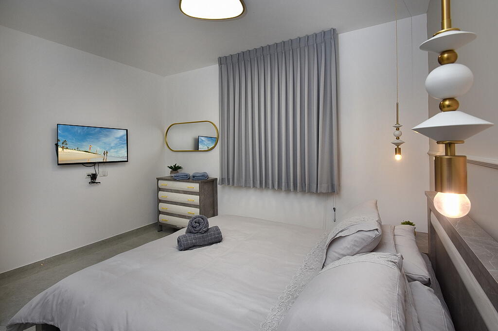 חדר השינה מציע מיטה זוגית מפנקת, שידות אחסון, מיזוג אוויר וטלוויזיה 40 אינץ' עם חיבור ל-YES.