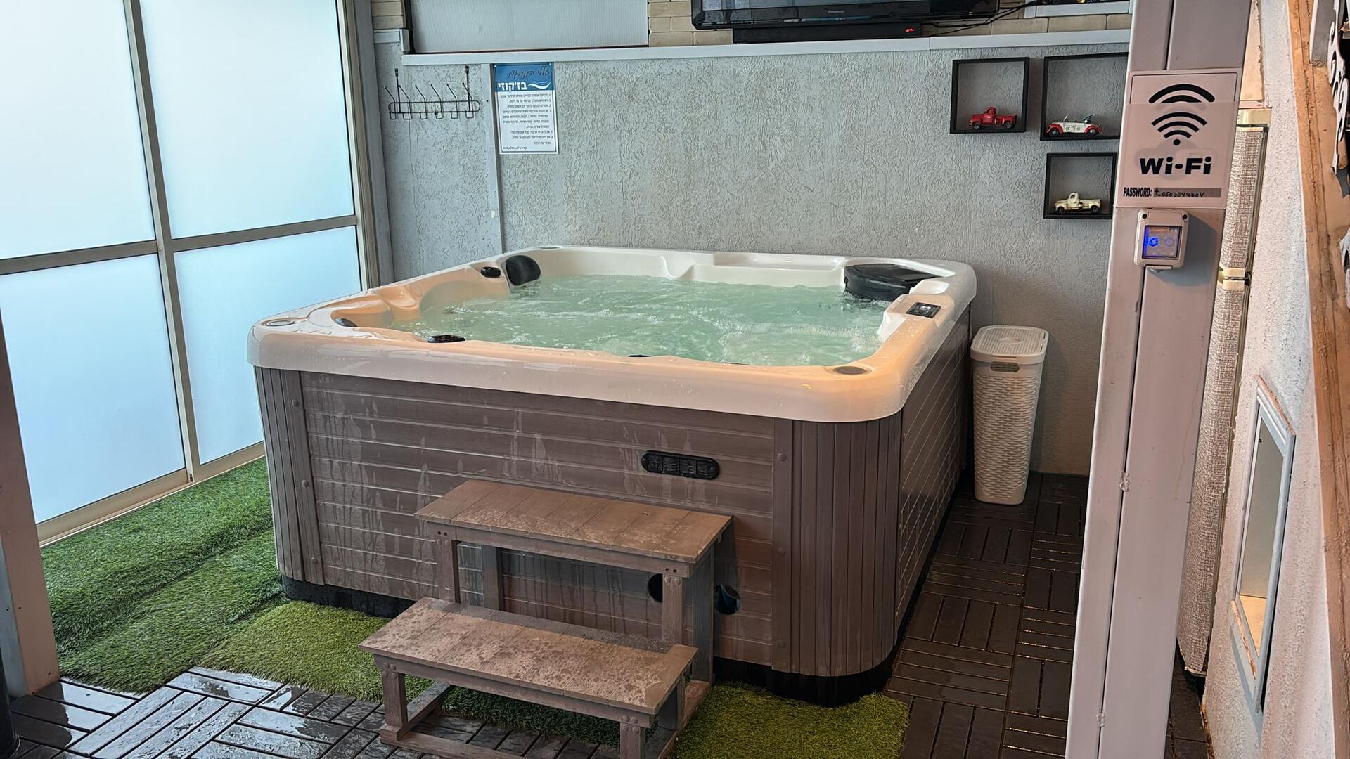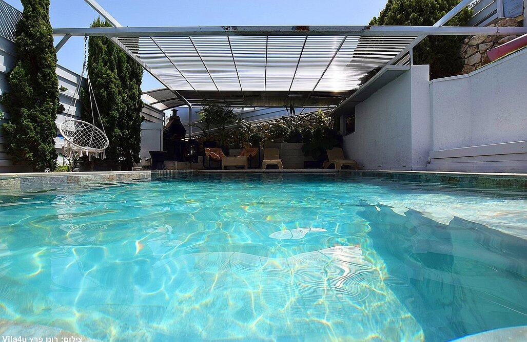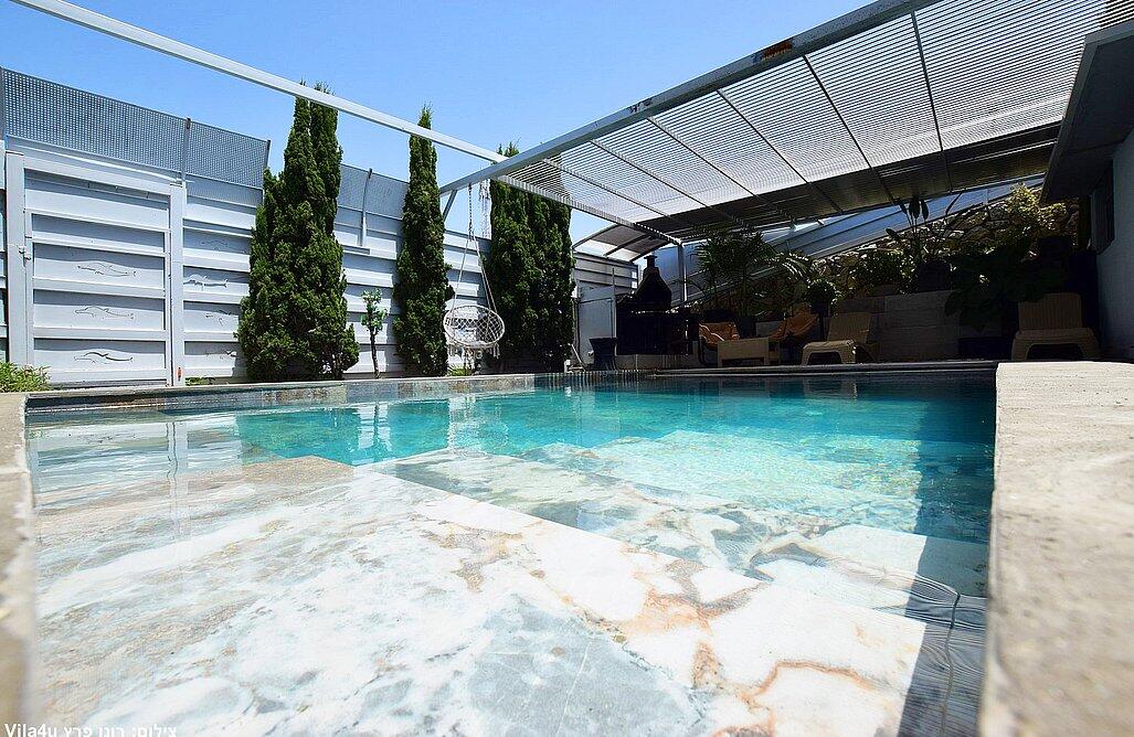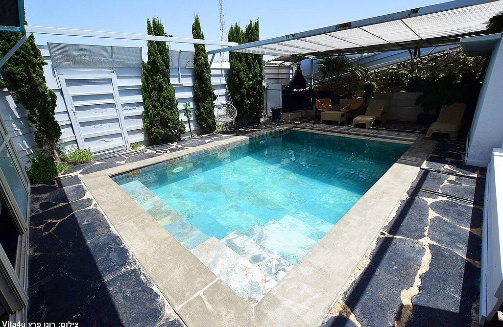 החצר הפרטית כוללת בריכת שחייה גדולה, ג׳קוזי ספא מקורה, פינות ישיבה נוחות, מיטות שיזוף ועמדת מנגל מקצועית – שילוב בין טבע ליוקרה.