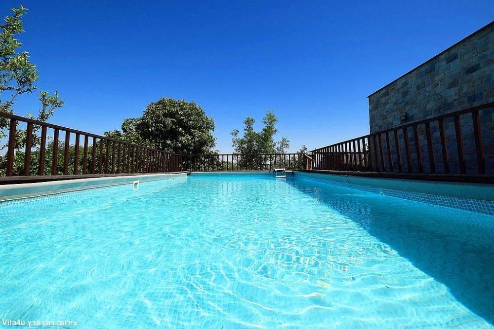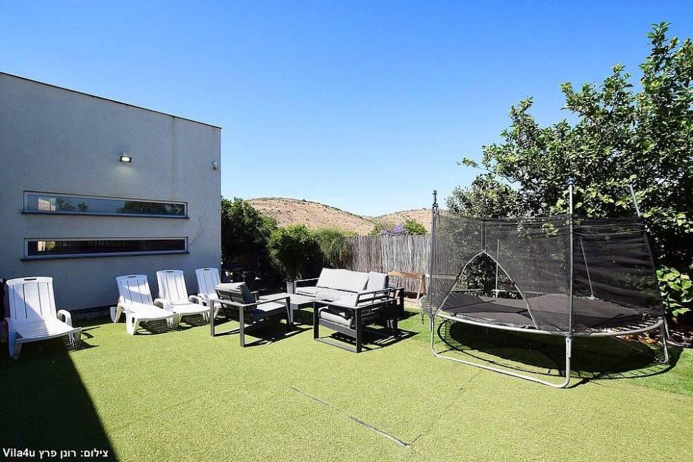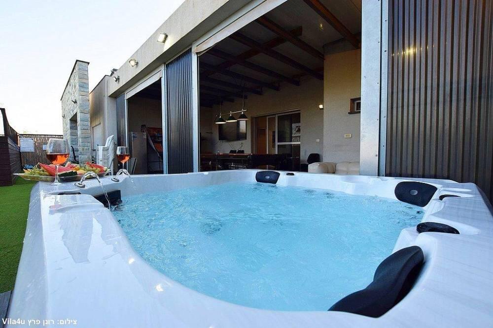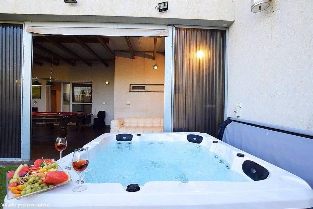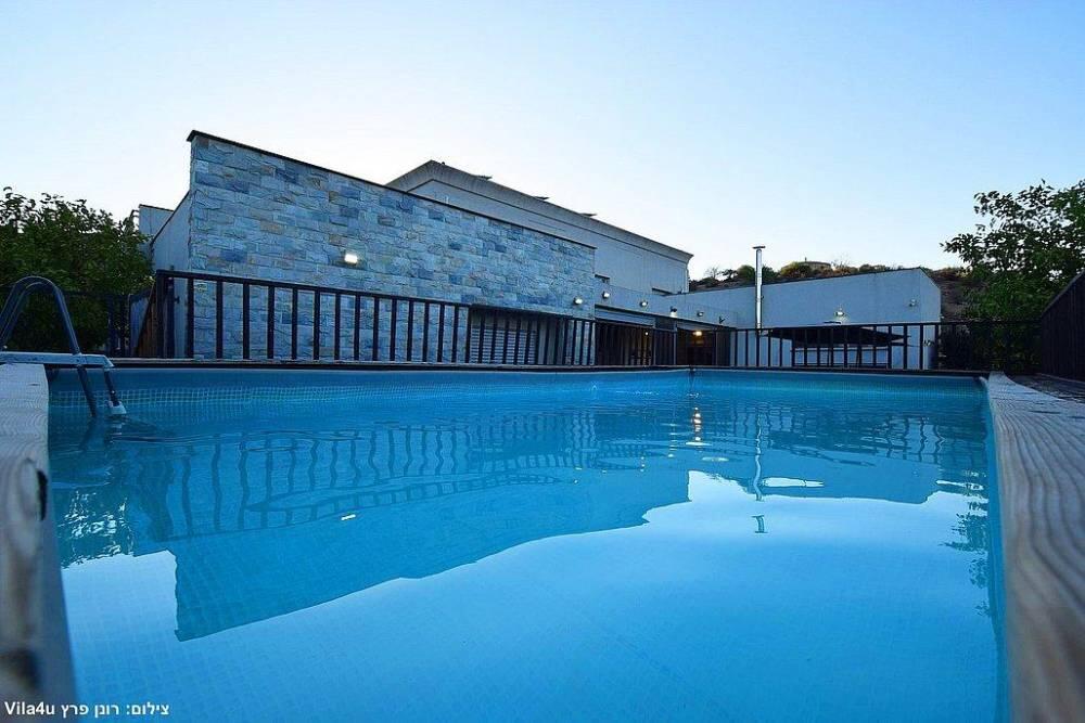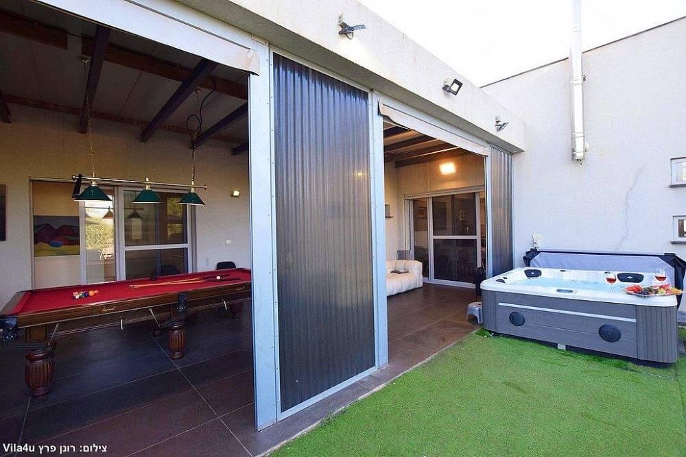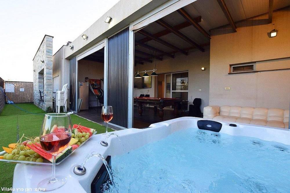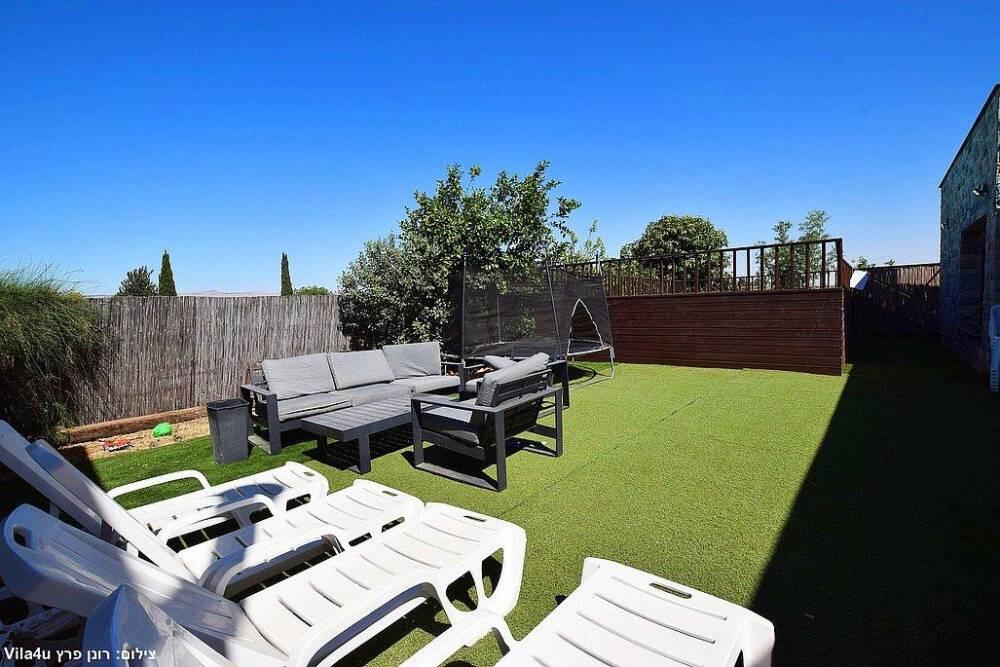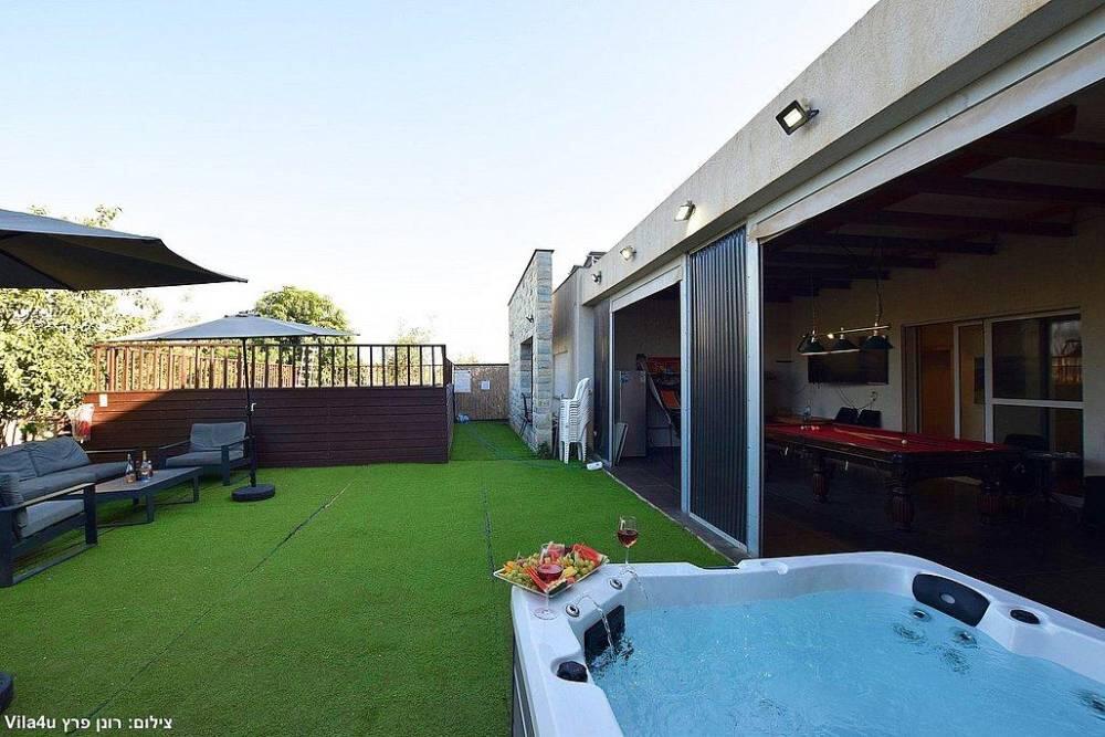 חצר מטופחת עם בריכה מחוממת, ג'קוזי ספא, פינות ישיבה ומדשאות ירוקות, מתאימה למשפחות וקבוצות עד 34 איש, עם שירות אישי ברמה הגבוהה ביותר.