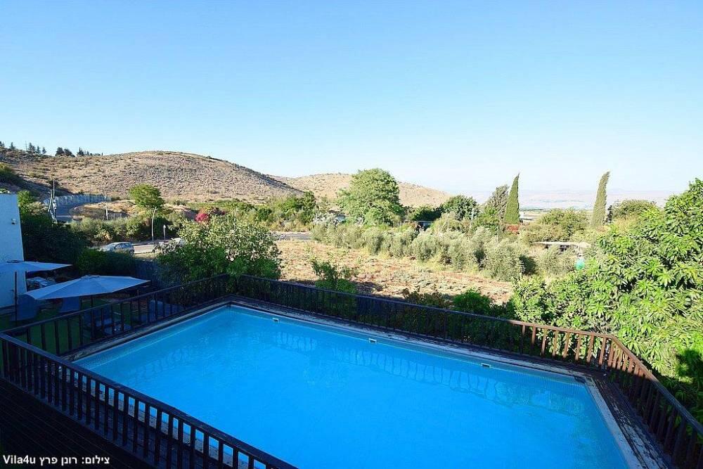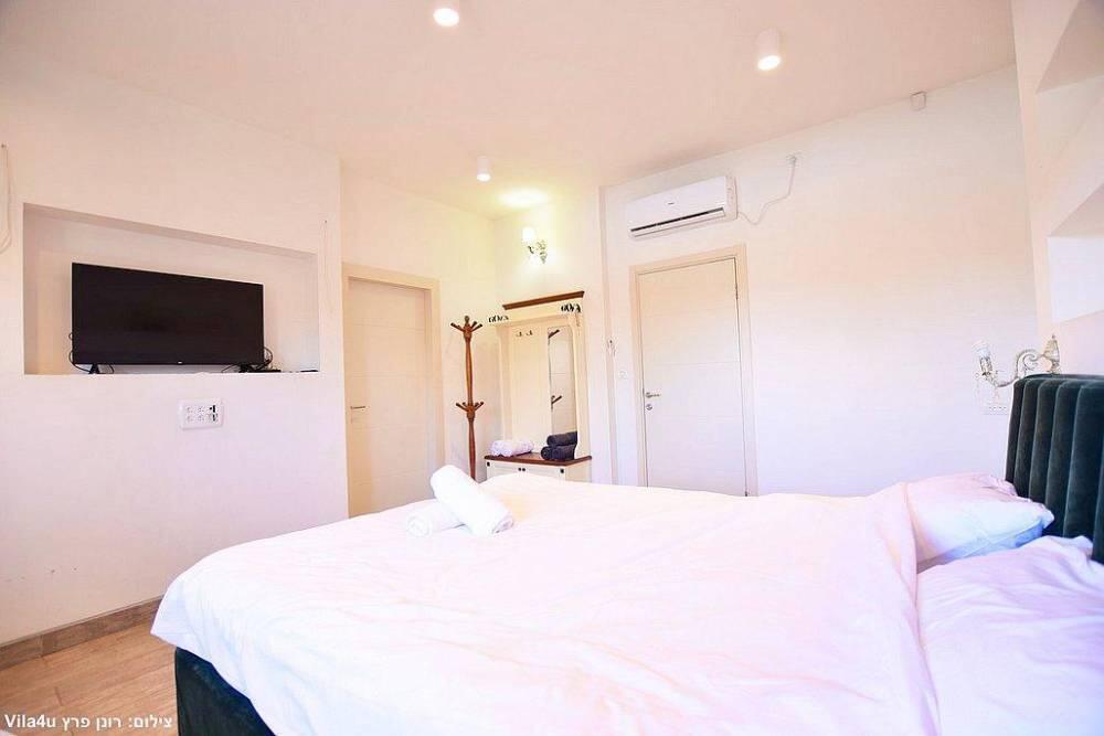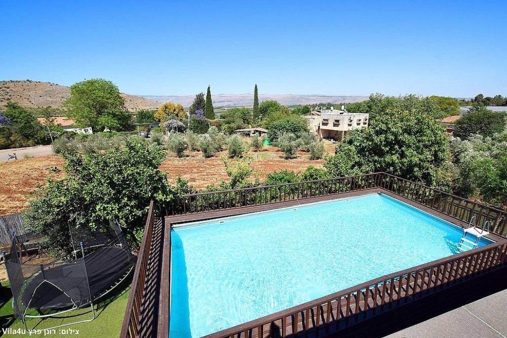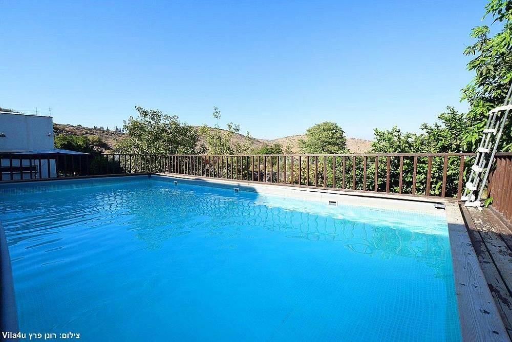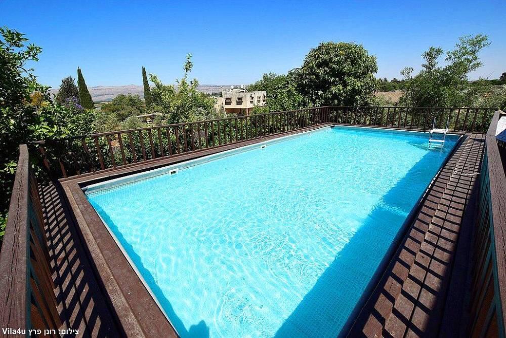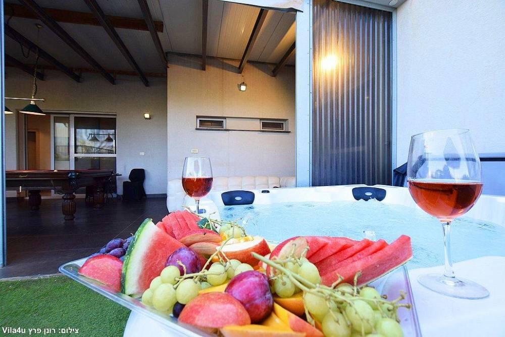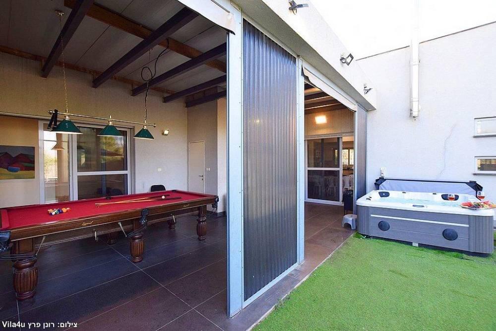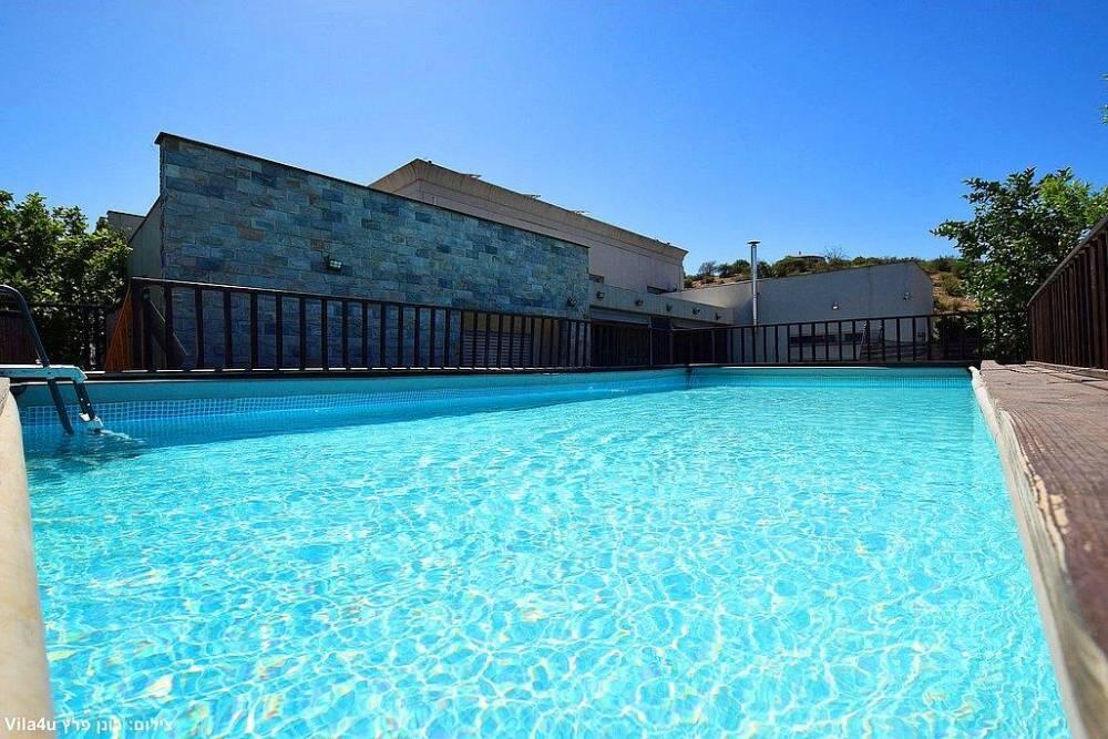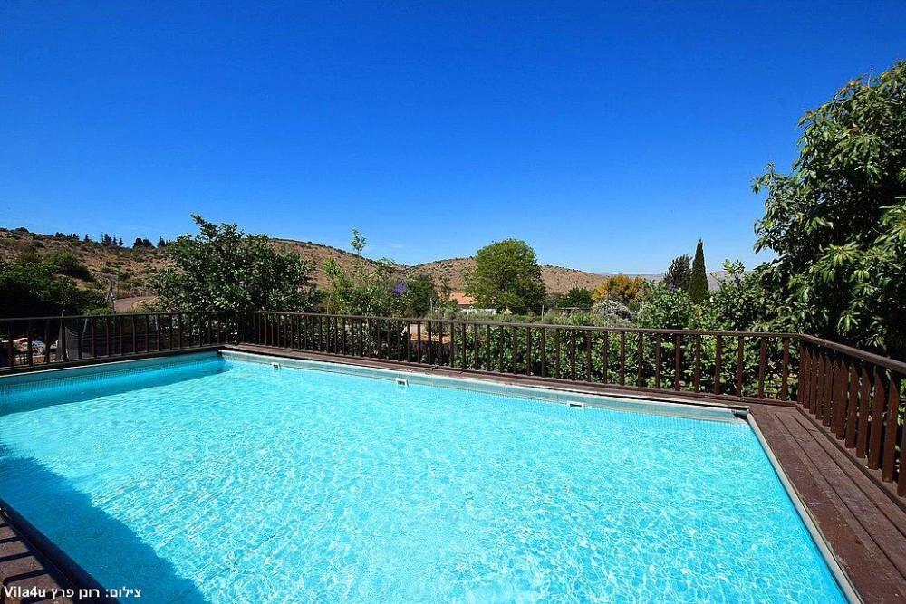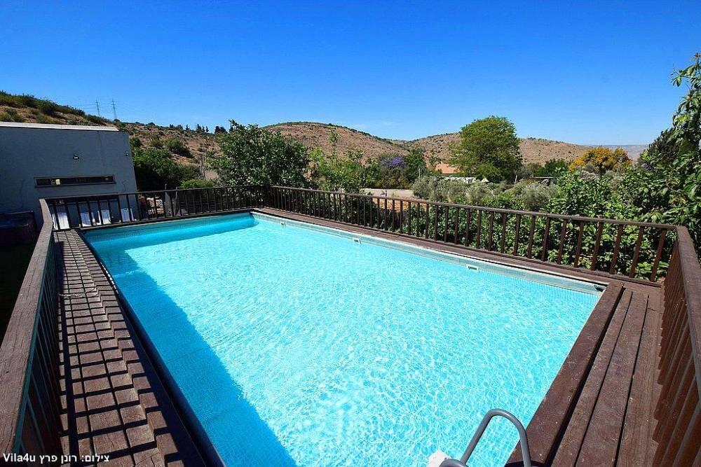חצר מטופחת עם בריכה מחוממת, ג'קוזי ספא, פינות ישיבה ומדשאות ירוקות, מתאימה למשפחות וקבוצות עד 34 איש, עם שירות אישי ברמה הגבוהה ביותר.