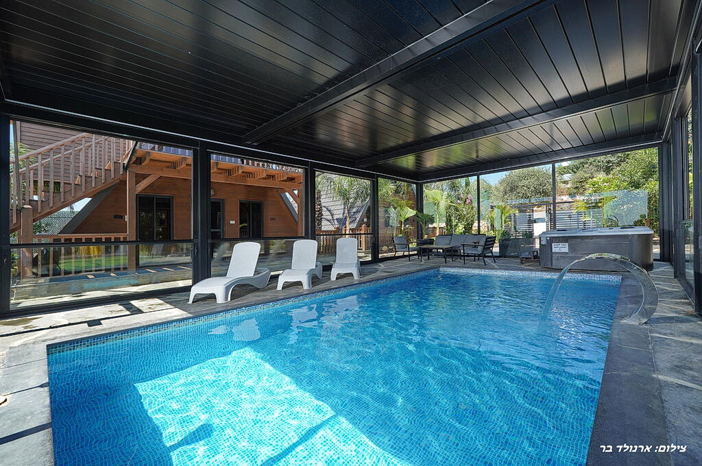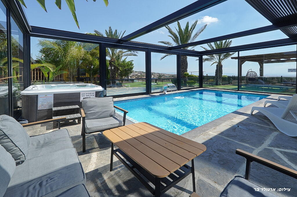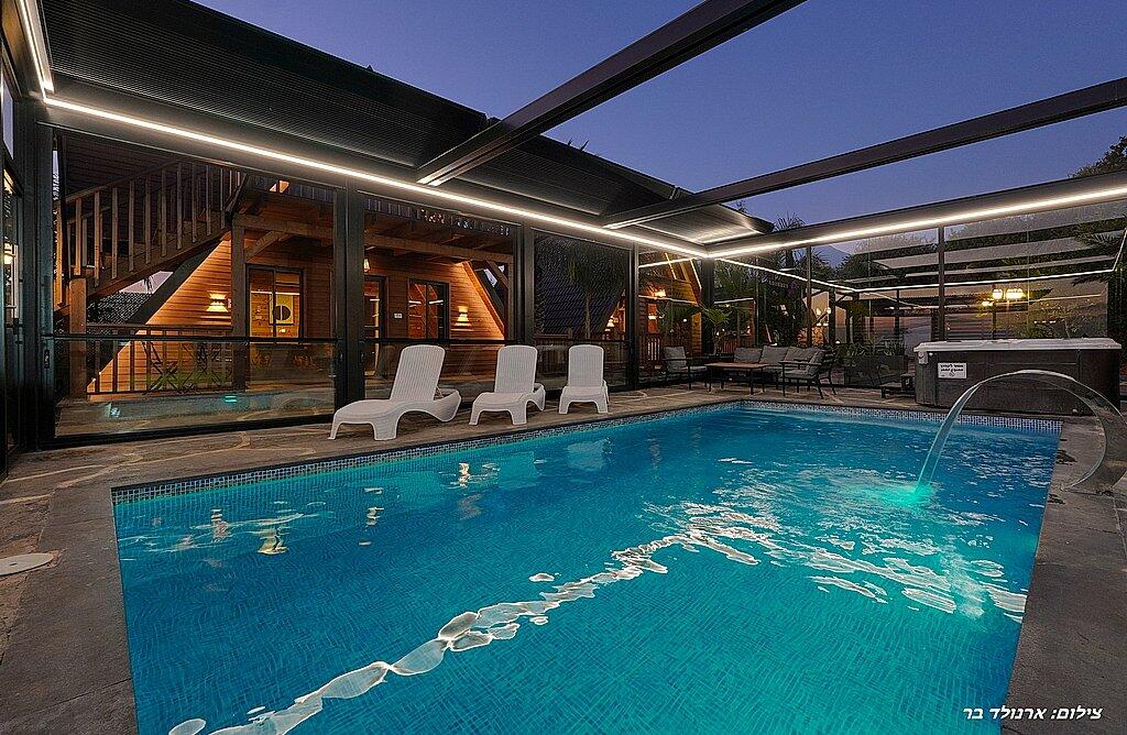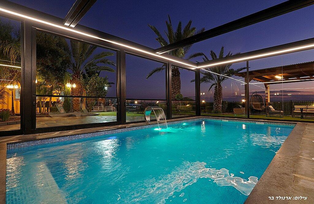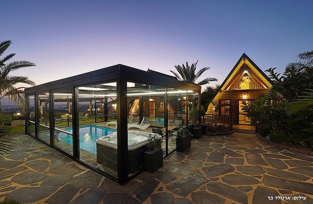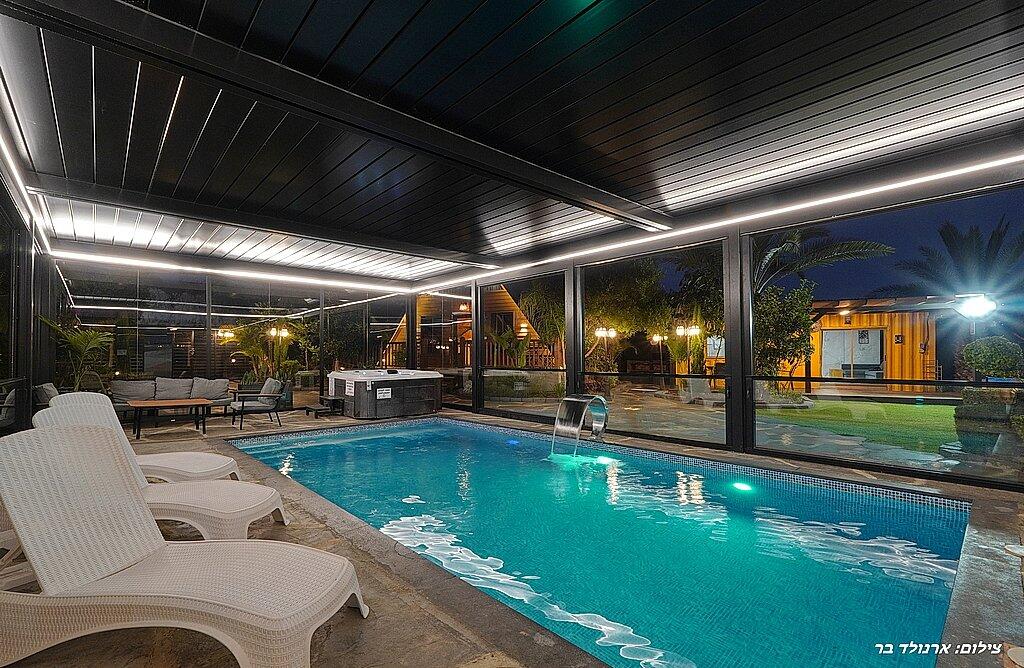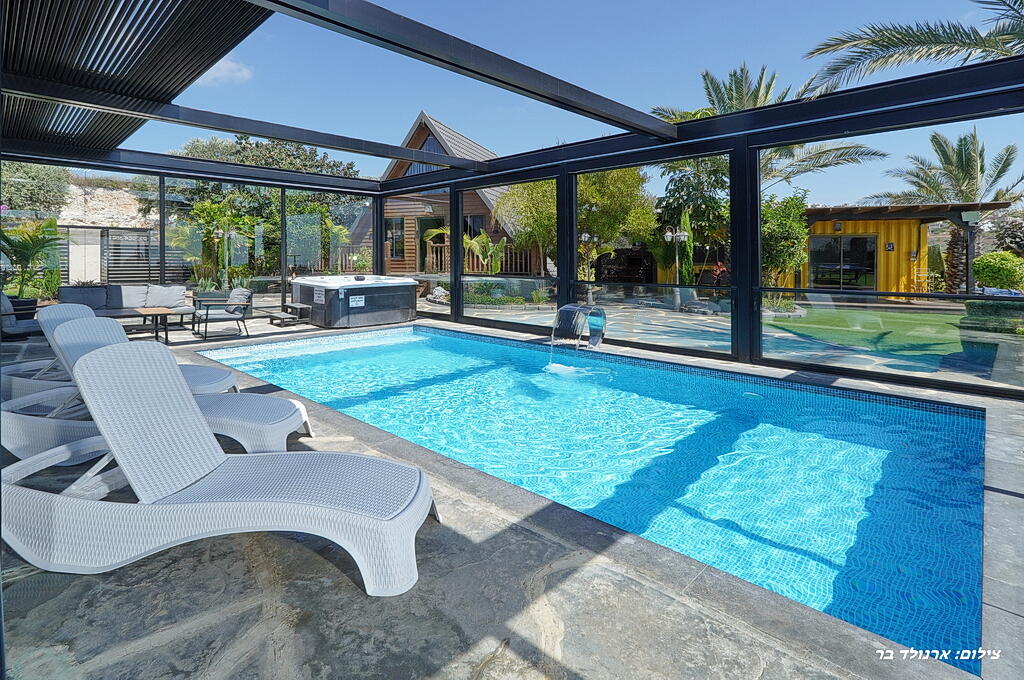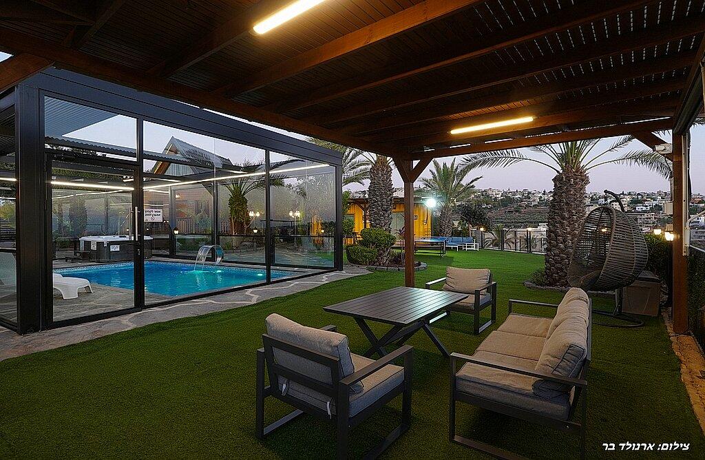במתחם החיצוני המדהים תמצאו חצר גדולה ומטופחת המותאמת גם לאירועים של עד 100 איש. המתחם כולל מדשאות ירוקות, בריכה מאובטחת מחוממת ומקורה עם נעילת ילדים, שולחנות משחק, עמדת מנגל בנויה מאבן, מתקני משחקים לילדים, ופינות ישיבה ושיזוף מפנקות במיוחד.