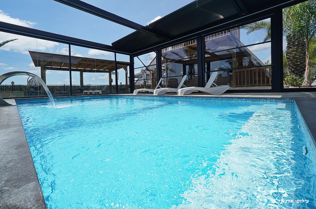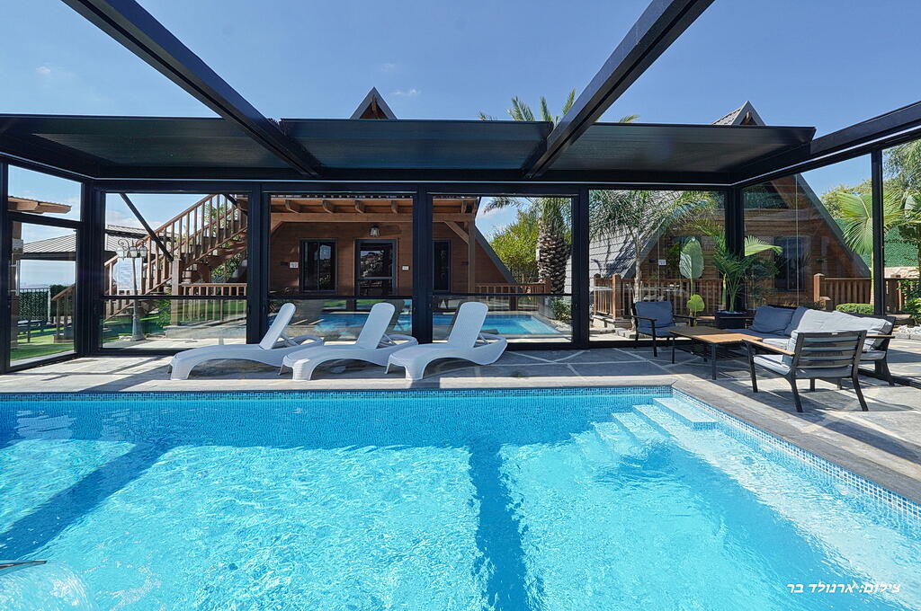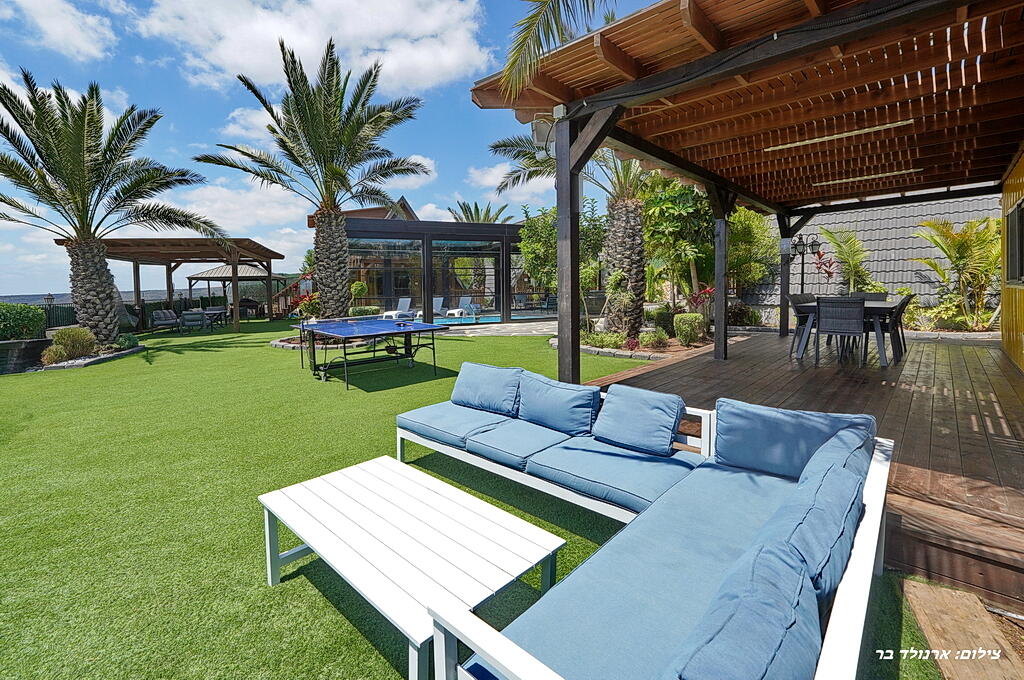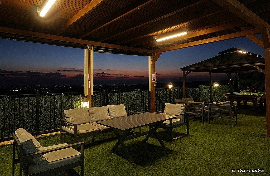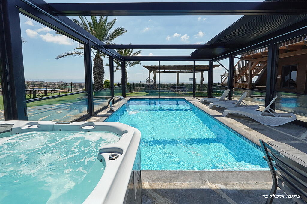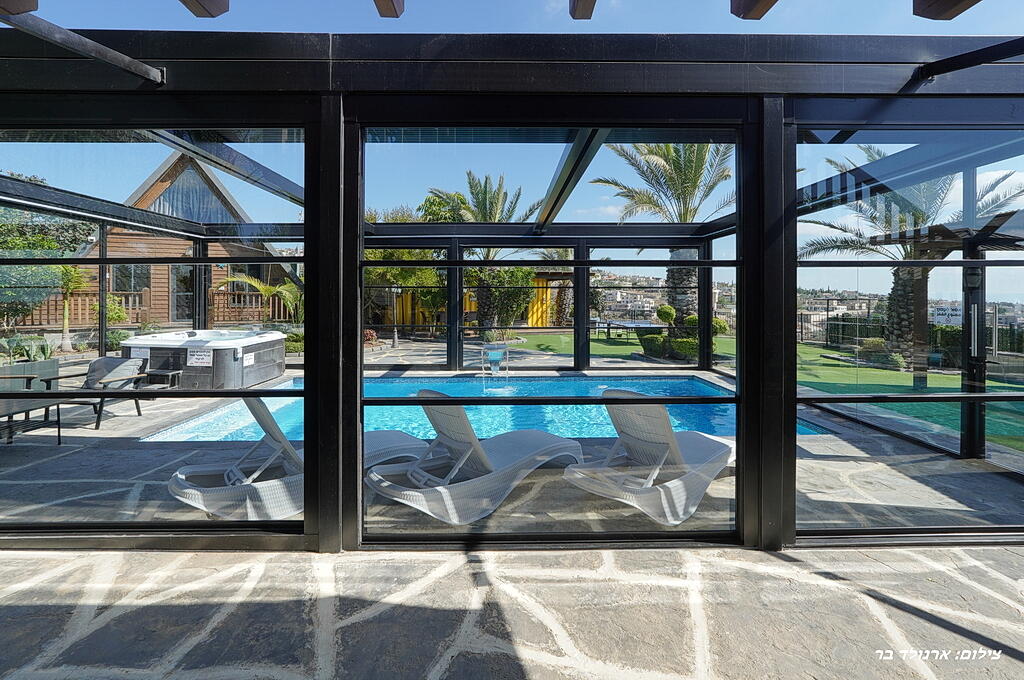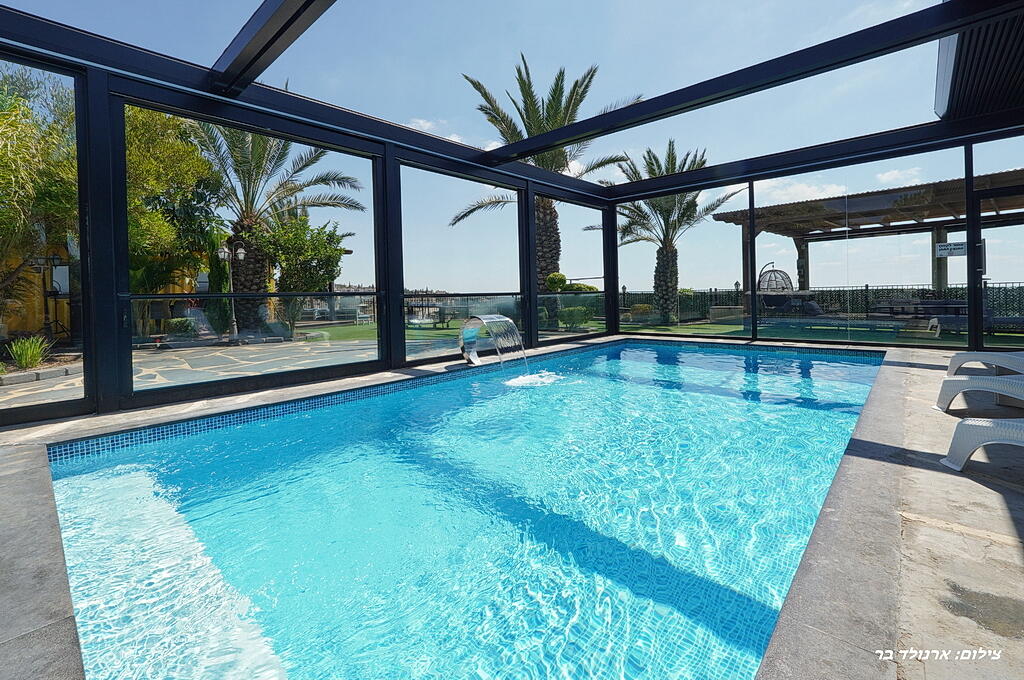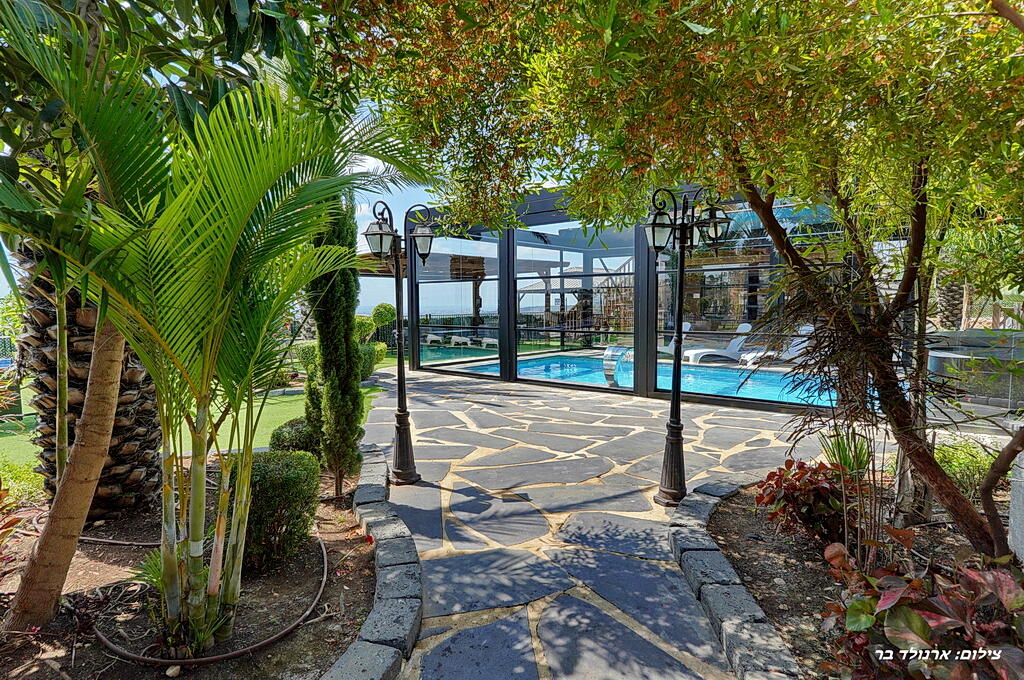 במתחם החיצוני המדהים תמצאו חצר גדולה ומטופחת המותאמת גם לאירועים של עד 100 איש. המתחם כולל מדשאות ירוקות, בריכה מאובטחת מחוממת ומקורה עם נעילת ילדים, שולחנות משחק, עמדת מנגל בנויה מאבן, מתקני משחקים לילדים, ופינות ישיבה ושיזוף מפנקות במיוחד.