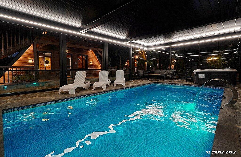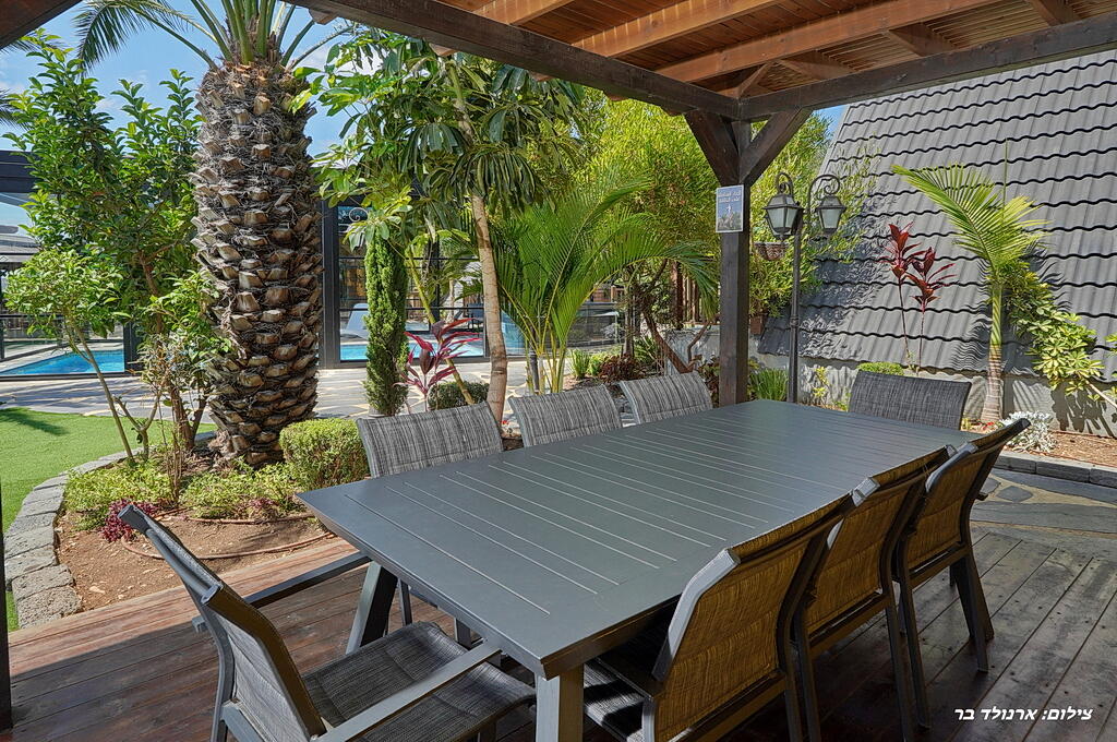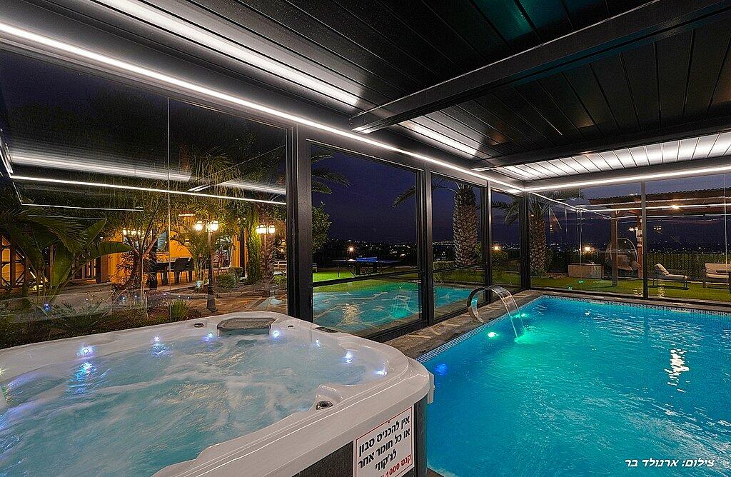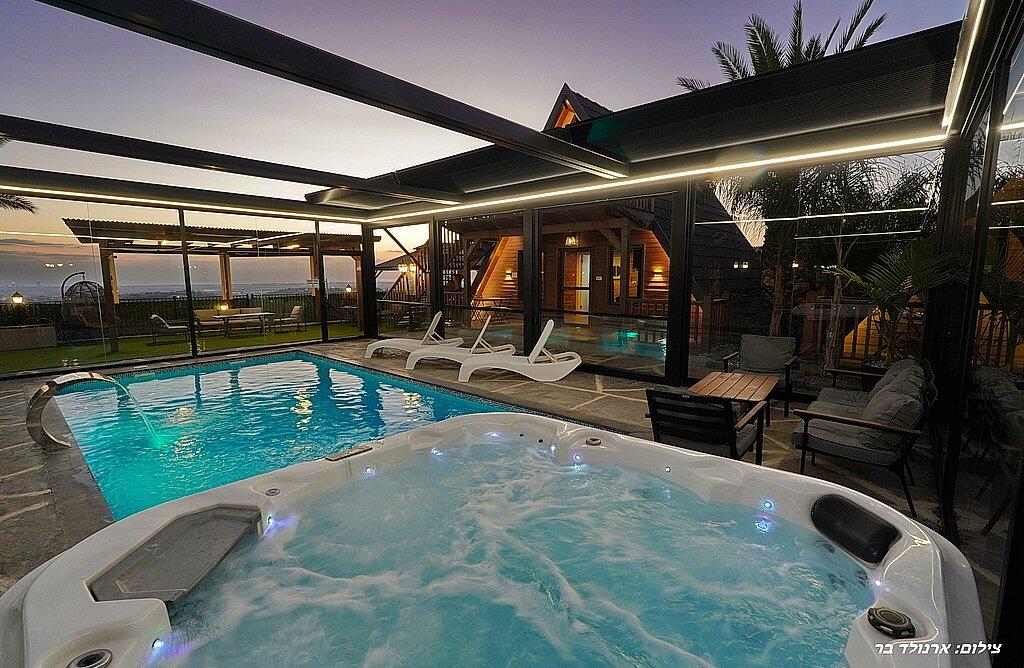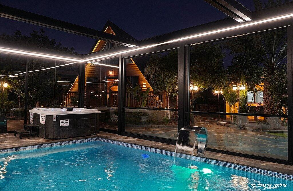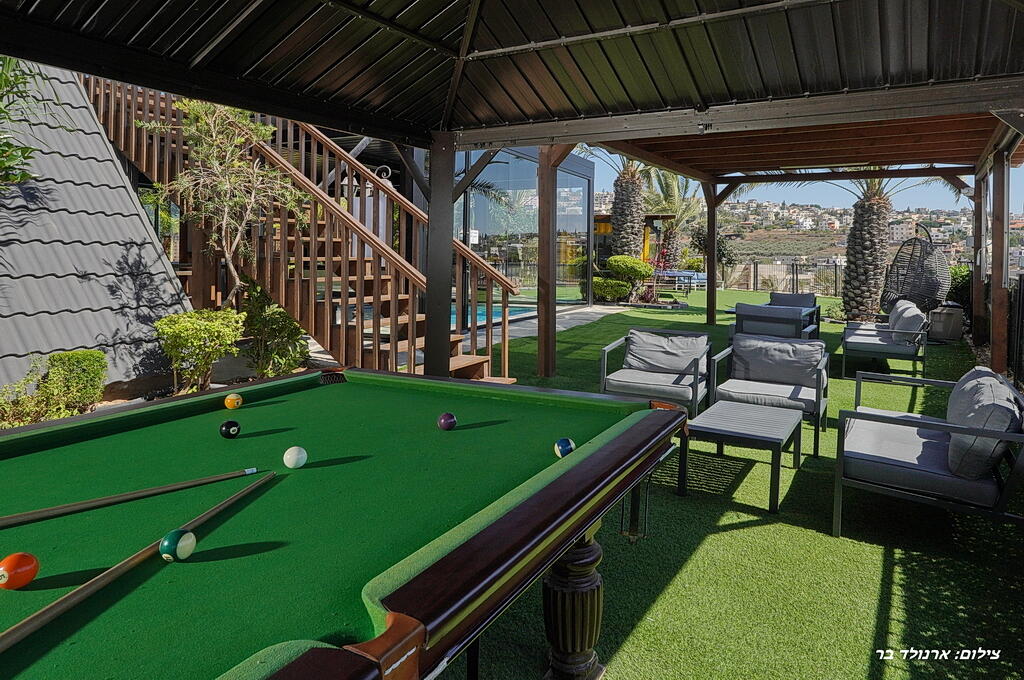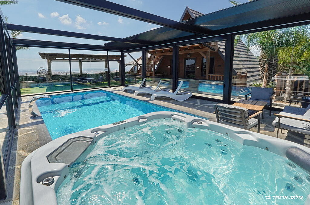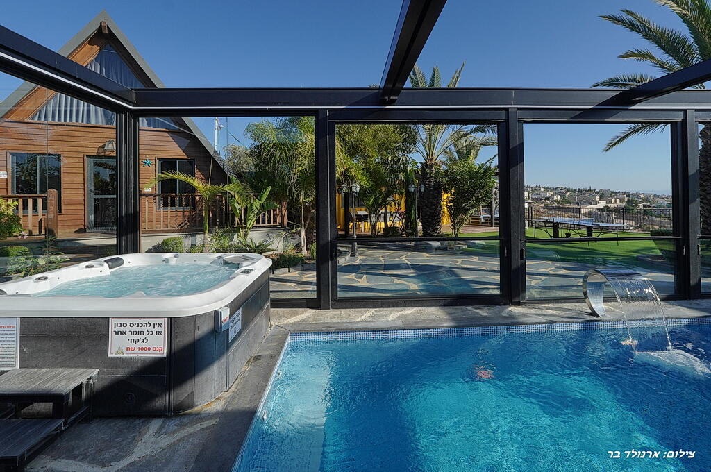 במתחם החיצוני המדהים תמצאו חצר גדולה ומטופחת המותאמת גם לאירועים של עד 100 איש. המתחם כולל מדשאות ירוקות, בריכה מאובטחת מחוממת ומקורה עם נעילת ילדים, שולחנות משחק, עמדת מנגל בנויה מאבן, מתקני משחקים לילדים, ופינות ישיבה ושיזוף מפנקות במיוחד.