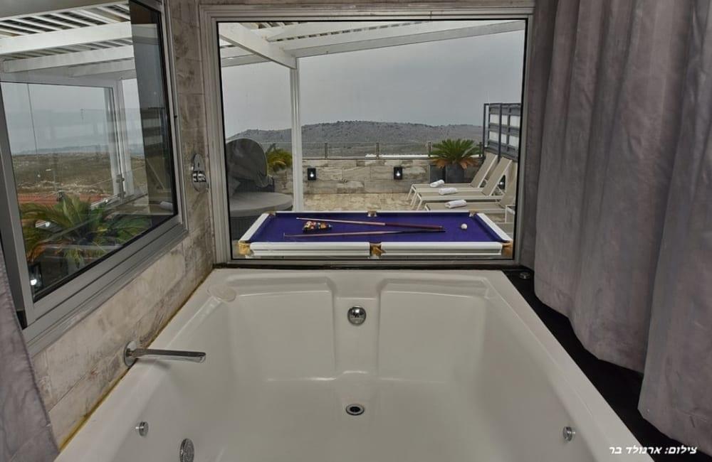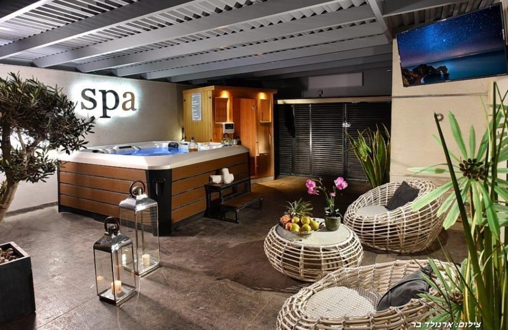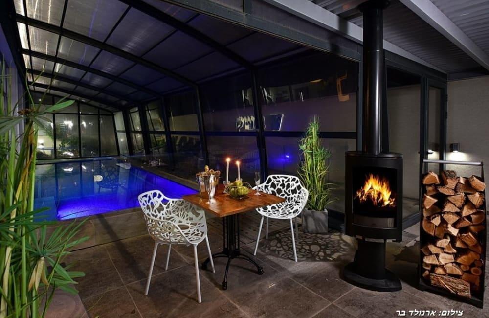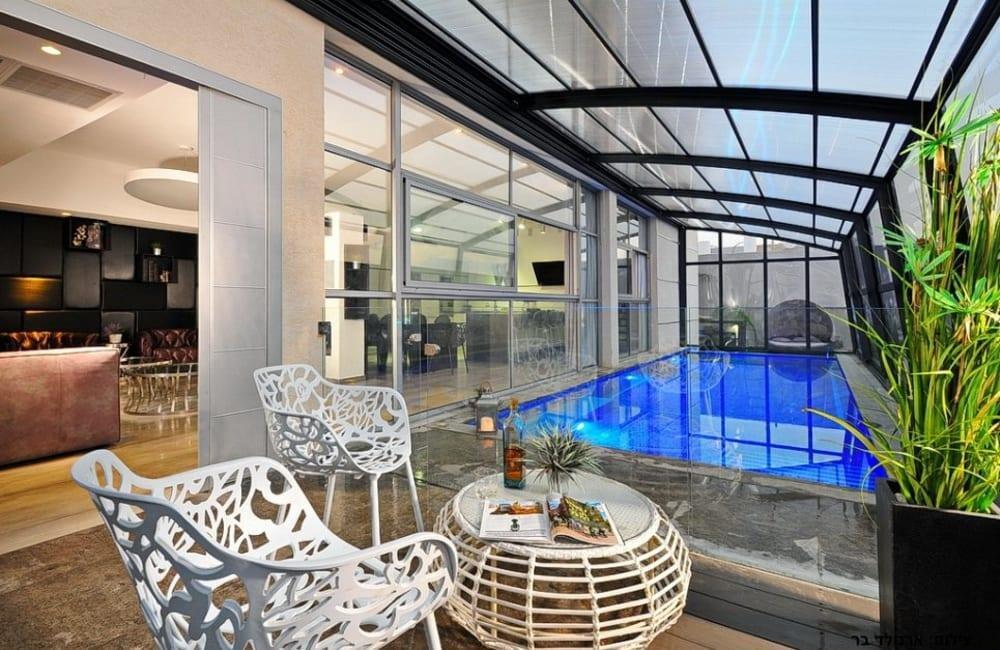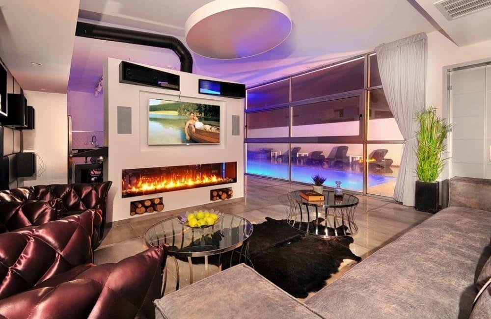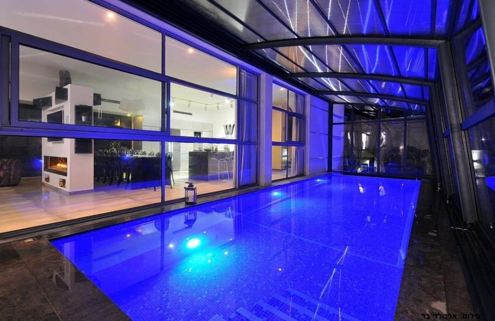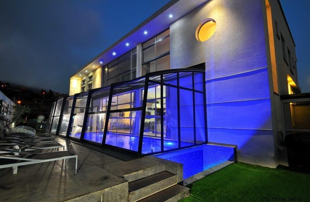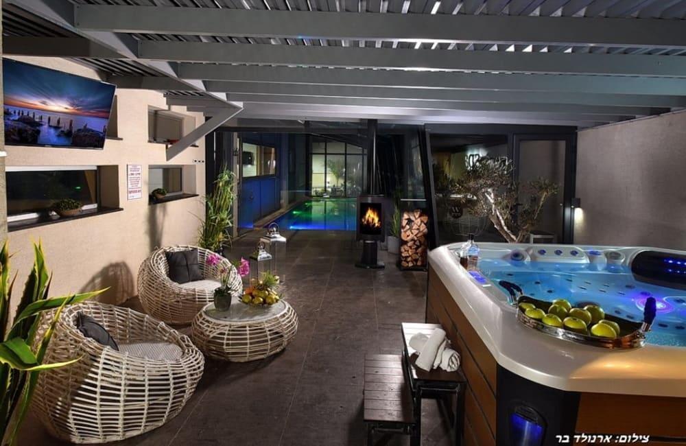 לוילה ישנה בריכה מחוממת ומקורה, מסך גדול, מתחם ספא עם ג'קוזי וסאונה ופינות ישיבה ,שיזוף ורביצה פזורים בכל מקום.