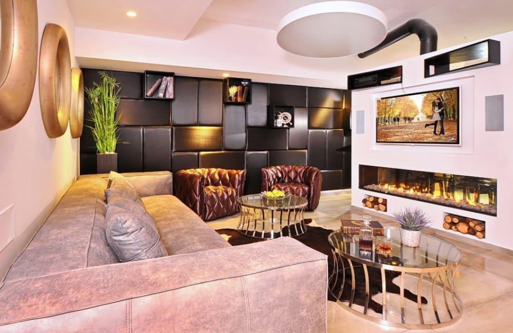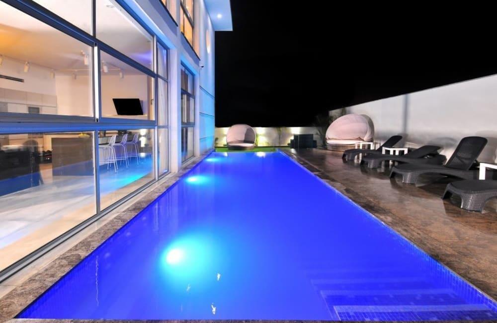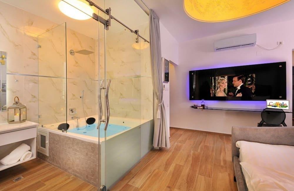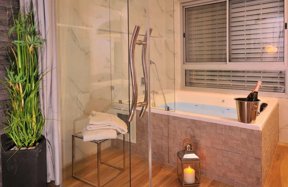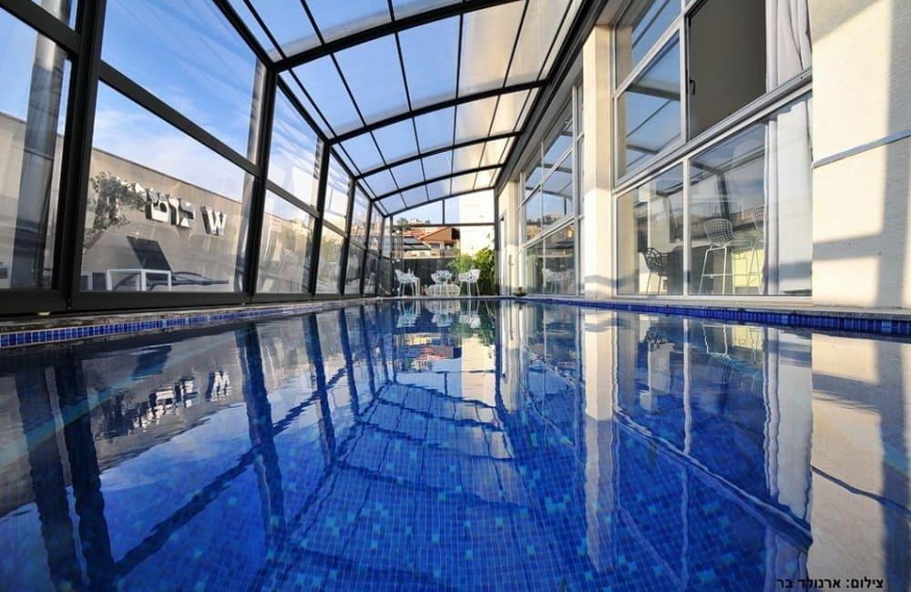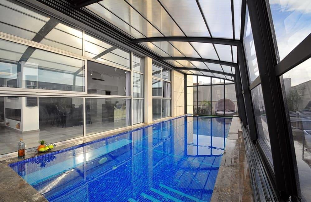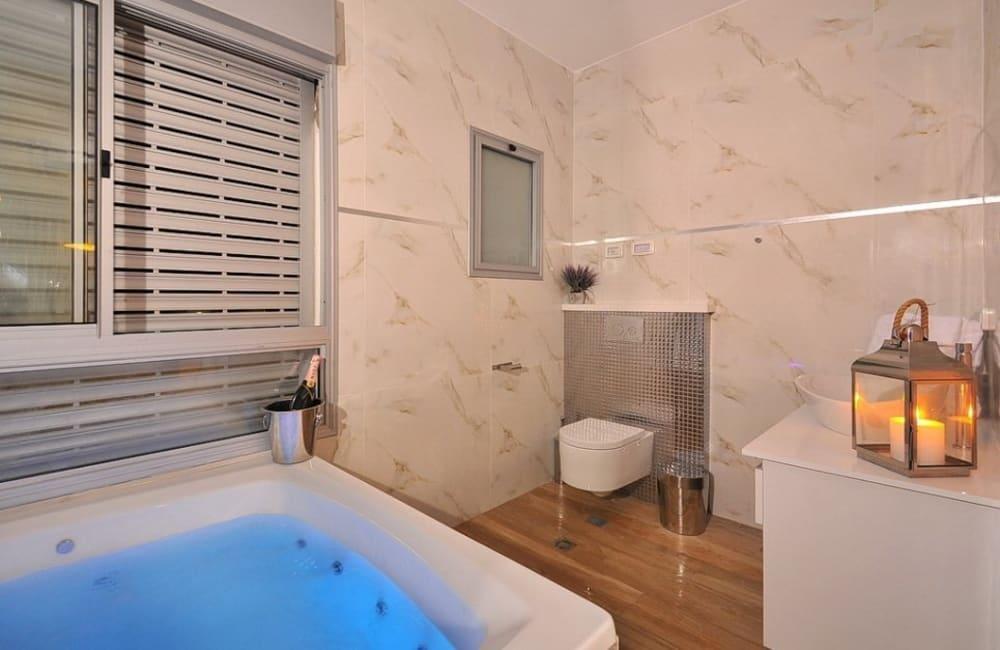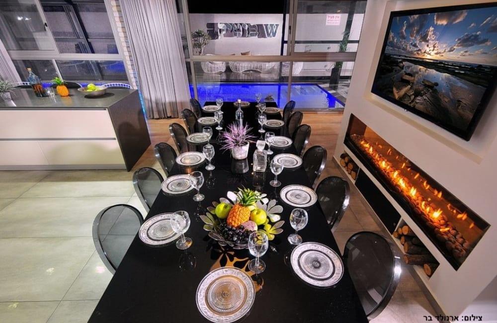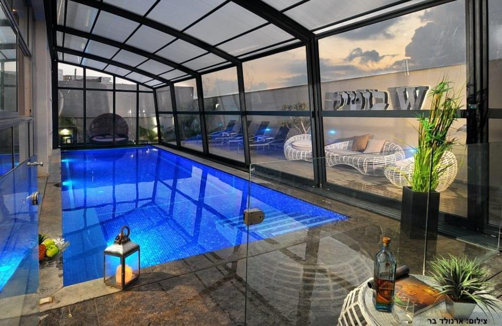 לוילה ישנה בריכה מחוממת ומקורה, מסך גדול, מתחם ספא עם ג'קוזי וסאונה ופינות ישיבה ,שיזוף ורביצה פזורים בכל מקום.