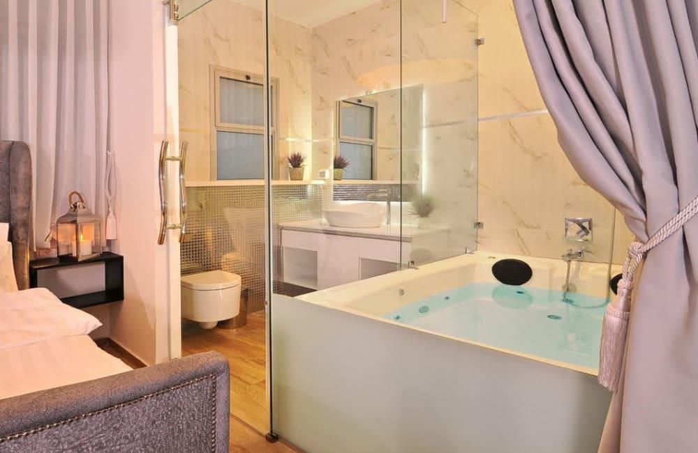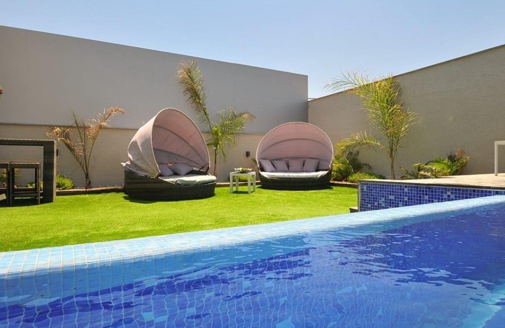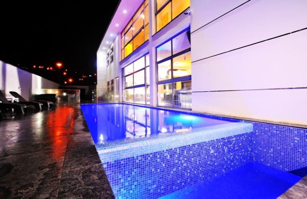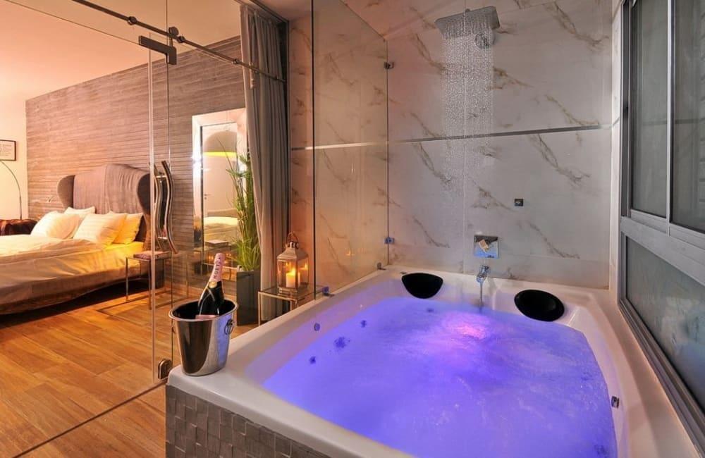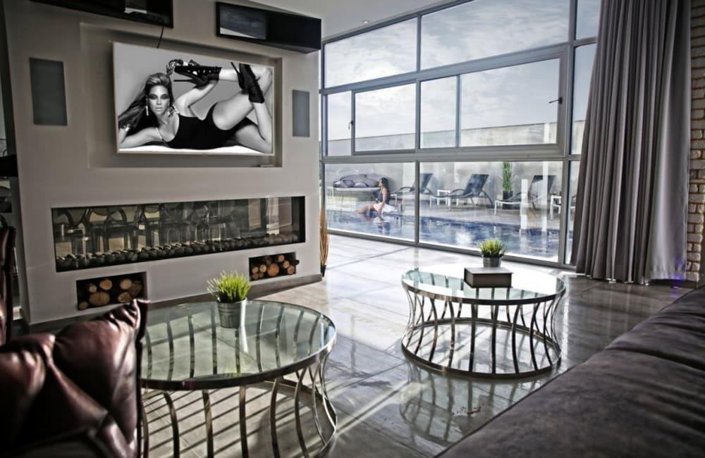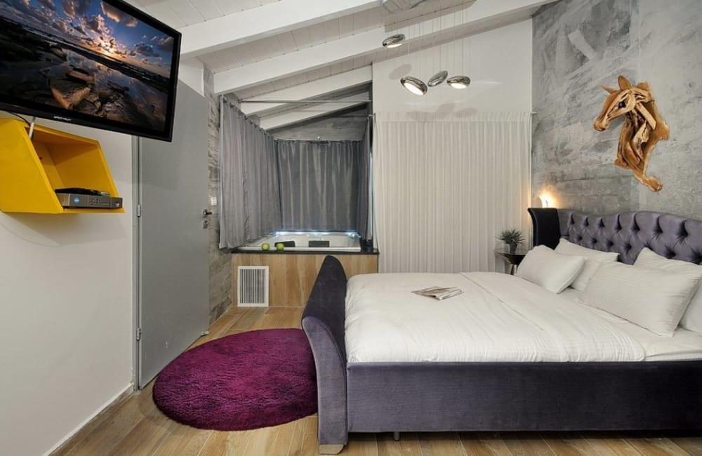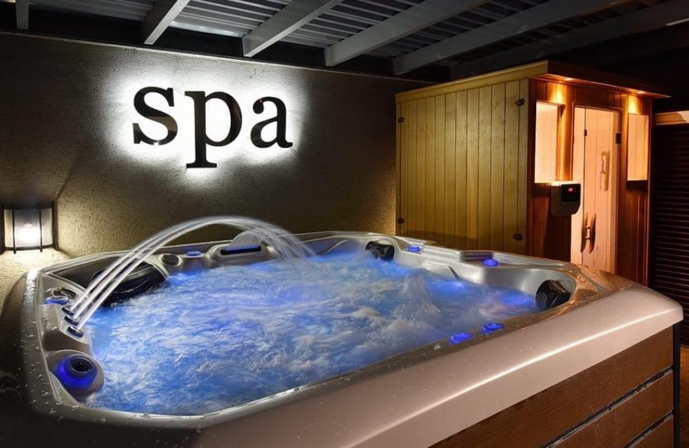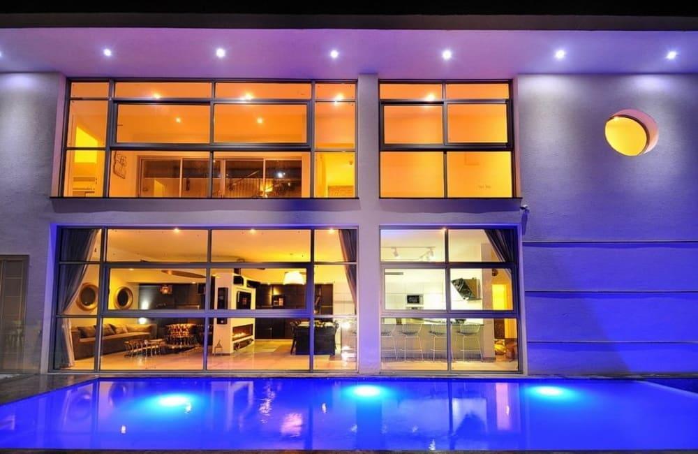 לוילה ישנה בריכה מחוממת ומקורה, מסך גדול, מתחם ספא עם ג'קוזי וסאונה ופינות ישיבה ,שיזוף ורביצה פזורים בכל מקום.