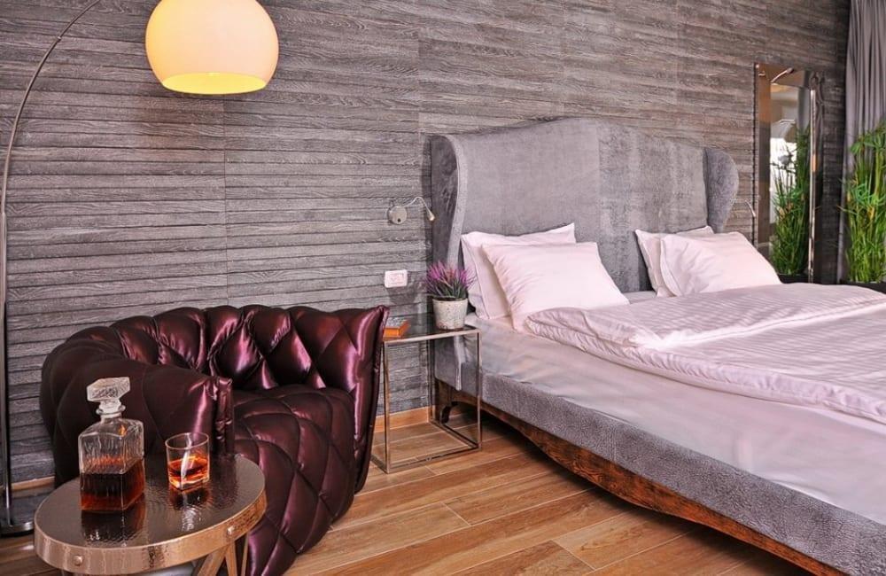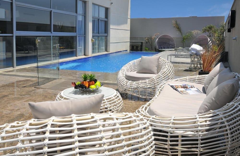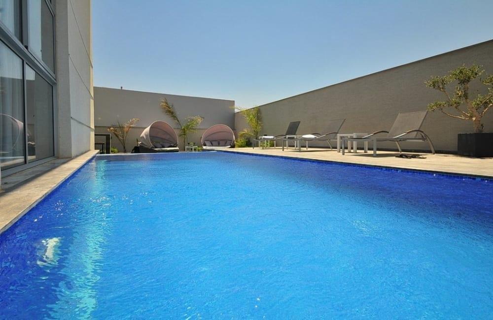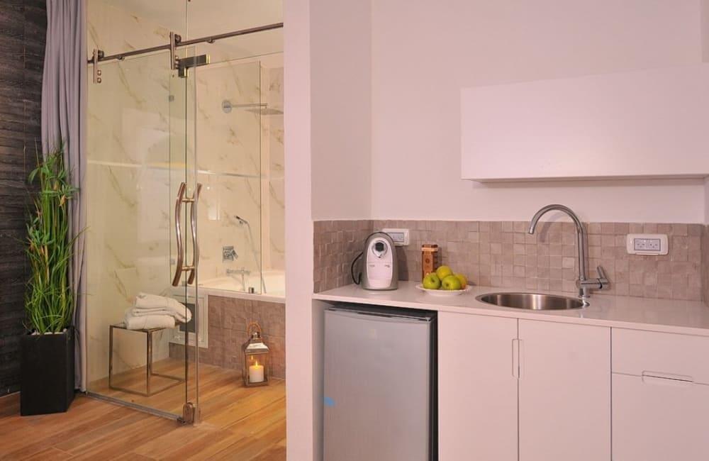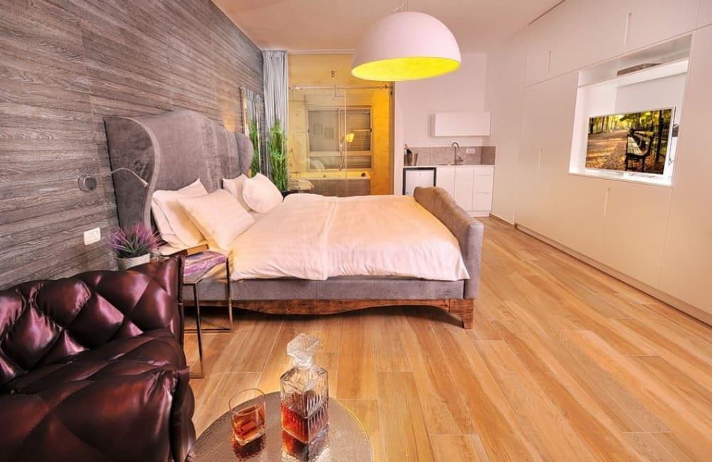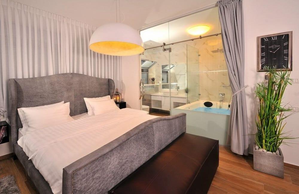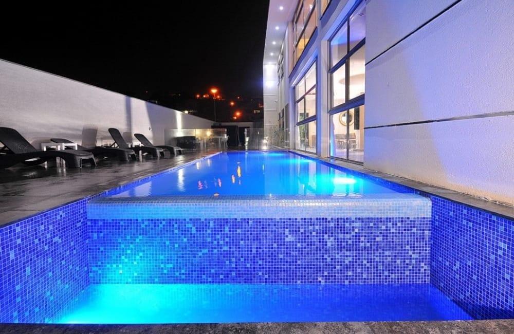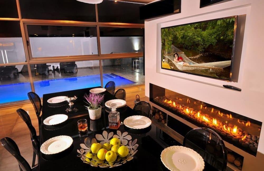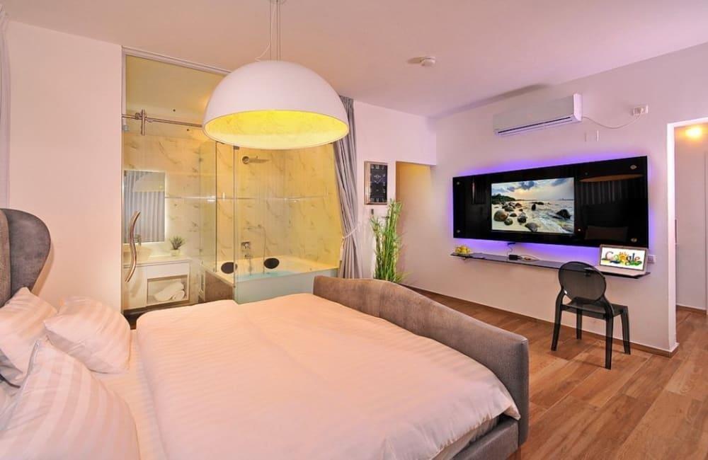 לוילה ישנה בריכה מחוממת ומקורה, מסך גדול, מתחם ספא עם ג'קוזי וסאונה ופינות ישיבה ,שיזוף ורביצה פזורים בכל מקום.